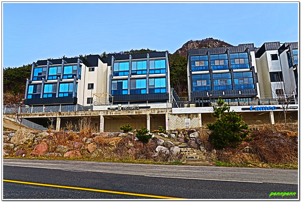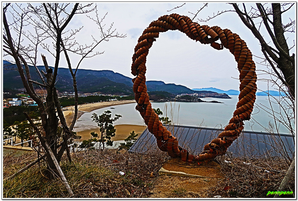 상록해변에는 오토캠핑장이 있어 캠퍼들이 가끔 보입니다. 상록해변 끝에는 두포갯벌체험마을이 있네요. 이제 궁항방면으로 갑니다. 도로 우측의 농협생명 변산수련원 건물이 웅장하고 인접한 숙박시설도 매우 산뜻합니다. 언덕 위에는 일마레제빵소와 리조트가 있고 하트조형물 뒤로는 방금 지나온 상록해수욕장이 보입니다.