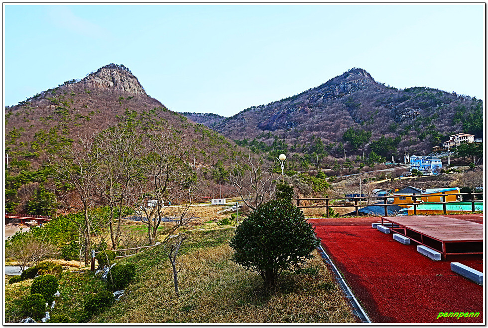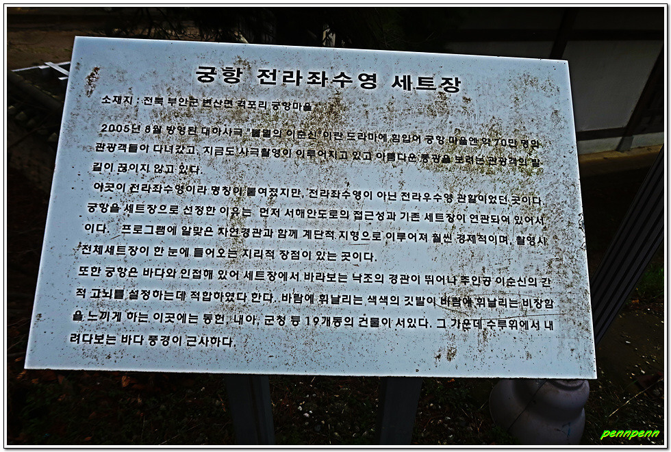 궁항마을에서 방파제와는 반대방향인 북쪽으로 갑니다. 소박한 마을의 가옥 담장에는 깜찍한 인형조형물이 놓여있어 길손의 발걸음을 멈추게 하더군요. 제법 큰 규모의 펜션을 지나가는데 좌측으로 보이는 아담한 해변이 그림 같습니다. 포장된 도로를 따라 언덕을 오르면 궁항 전라좌수영 세트장입니다. 이곳은 불멸의 이순신 촬영세트장이지만 현재 시설물 정비로 휴관중이어서 내부를 둘러보지 못해 못내 아쉽습니다.