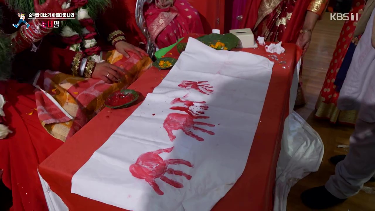 힌두교 전통결혼식에서는 신랑은 신부에게 많은 선물을 보내는데, 신랑이 손바닥에 물감을 칠해 흰 보자기에 찍어서 보내면 신부도 손바닥을 찍어 화답한다고 합니다. 신랑은 네팔의 전통의상을 입고 결혼식장에 가기 전 신에게 기도를 올립니다. 아들의 결혼식장에 신랑의 어머니는 참석하지 않는답니다. 결혼식장에서 신부는 신랑이 가져온 흰 천에 손바닥을 찍으면 결혼이 성립합니다.