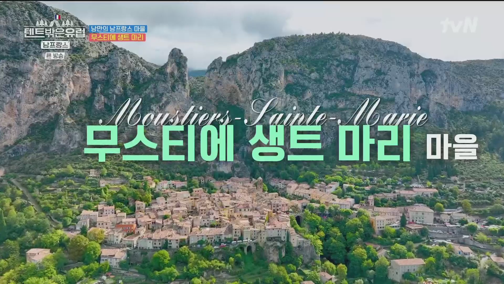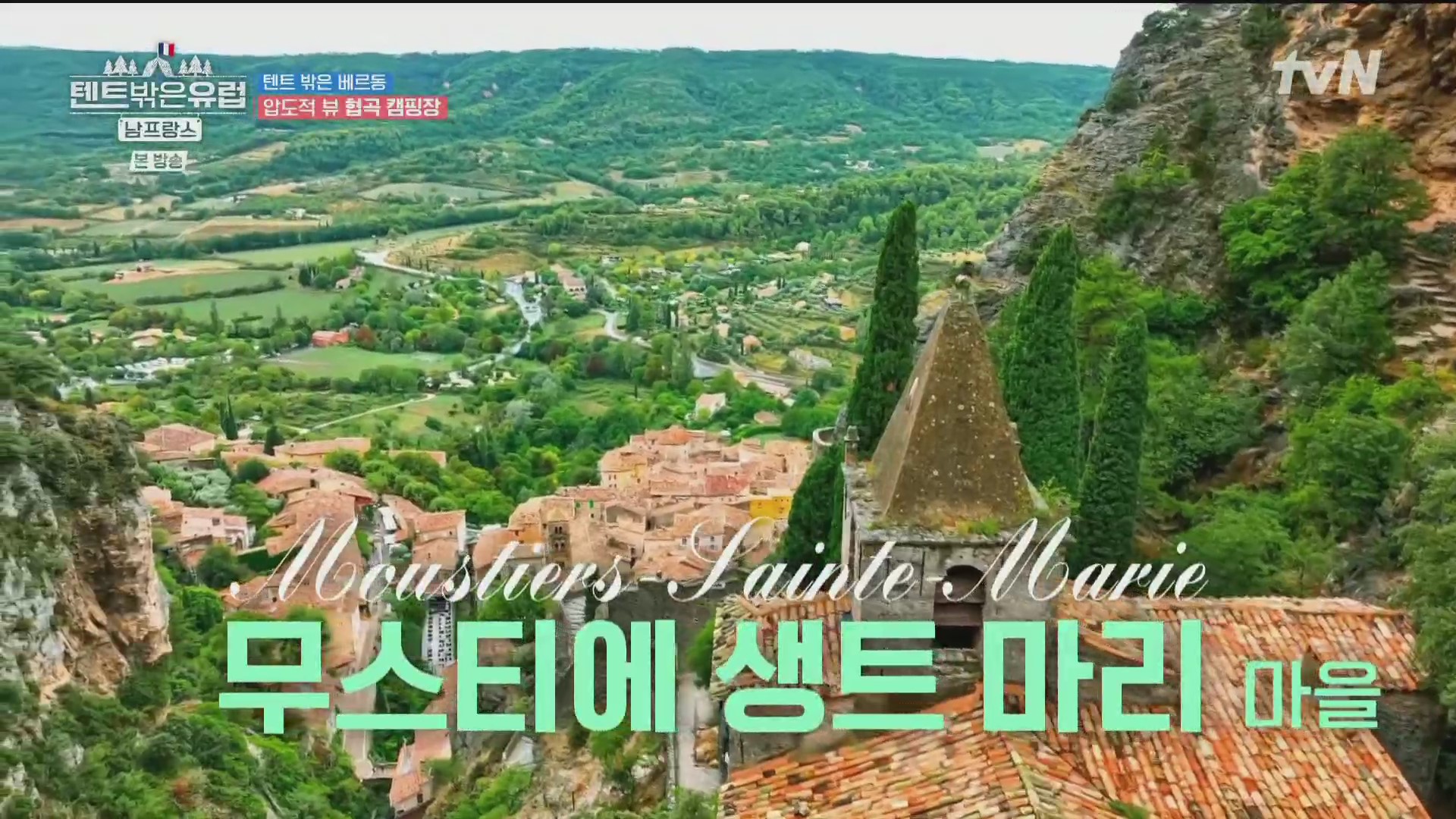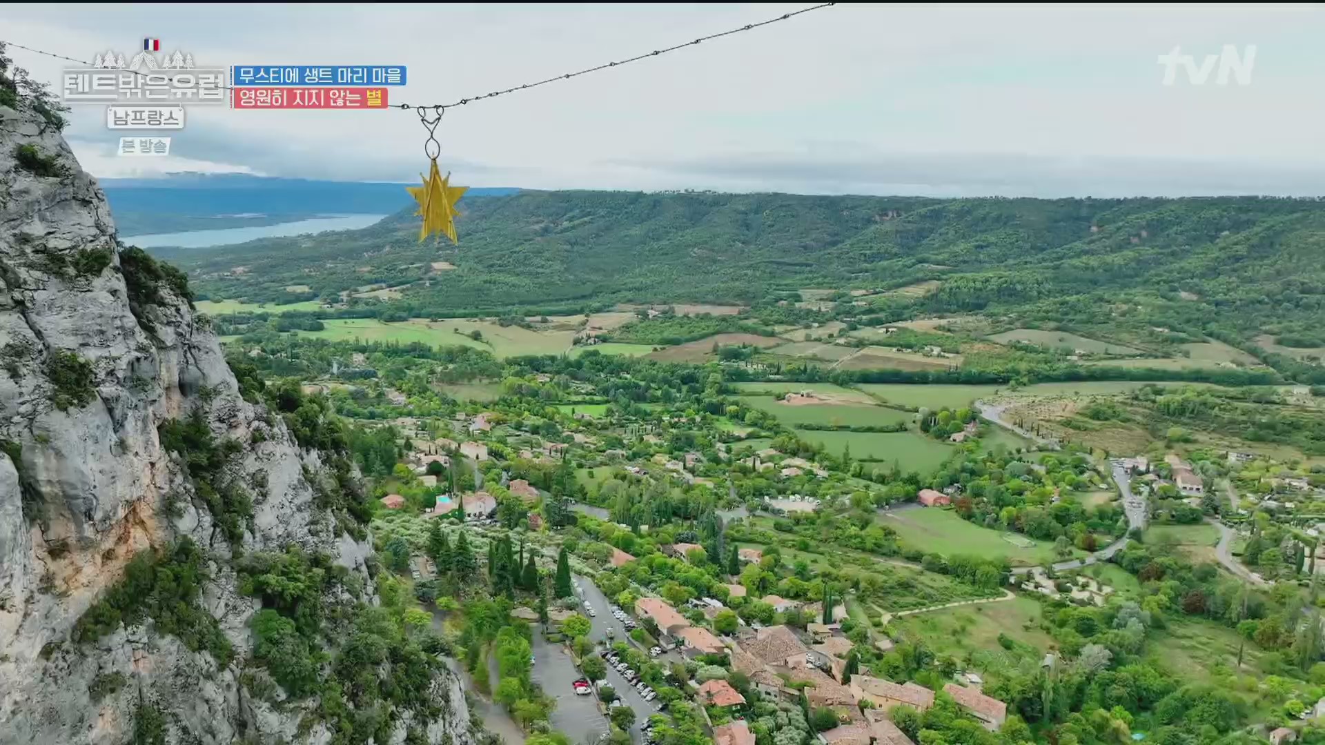 주룩주룩 내리던 비가 그치고 하늘이 맑아지자 4인방은 베르동 협곡의 작은 마을로 산책을 나갑니다. 걸어서 15분 거리에 있는 무스티에 생트 마리마을은 프랑스에서 가장 아름다운 마을 1위로 뽑힌 곳으로 주민 약 700여명이 거주하는 남프랑스 소도시입니다. 마침 전통시장이 열렸는데 다양한 식재료를 판매하네요. 참새가 방앗간을 그냥 지나치지 않듯 이들은 액세서리점에서 거금(100유로, 한화 약 144,000원)을 주고 공동으로 팔찌를 1개씩 구입합니다. 마을 뒤 협곡과 협곡 사이에는 황금별(크기 1.25m, 무게 150kg)이 걸려 있어 예로부터 낮에도 별을 볼 수 있는 마을로 알려져 있답니다.