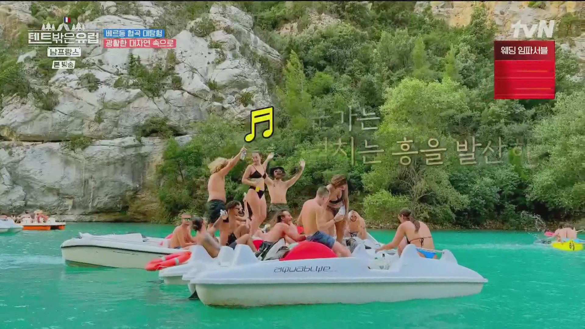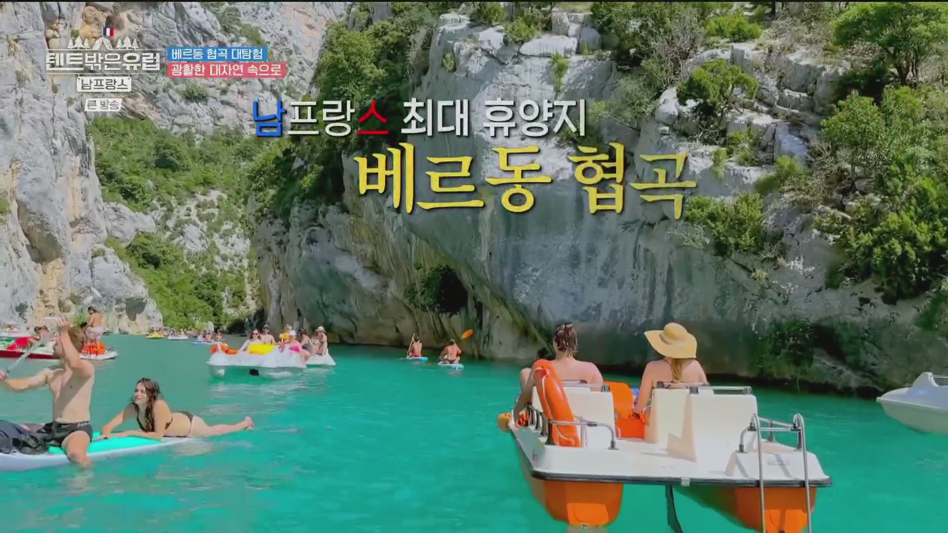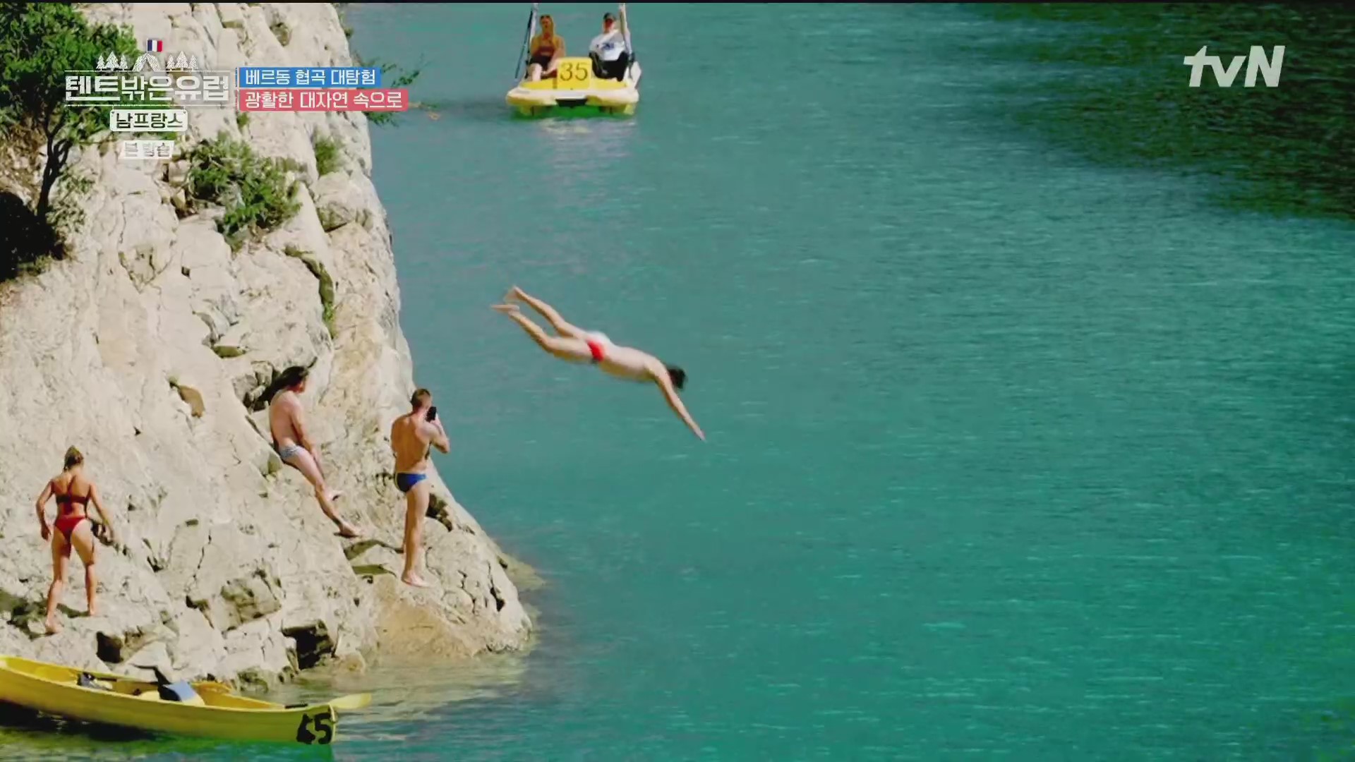마을 산책을 마치고 캠핑장으로 돌아온 이들은 라면을 끓여 점심을 먹고는 자동차를 몰고 베르동 협곡의 가장 매력적인 포인트인 교량으로 갑니다. 4인용 페달보트를 빌린 이들은 다리 밑을 통과해 본격적으로 협곡에 진입합니다. 보이는 것이라고는 기암절경의 대자연이어서 탄성이 저절로 나옵니다. 수영복을 입은 사람들은 절벽 위로 올라가 다이빙을 하거나 수영하는 이들도 많이 보입니다.