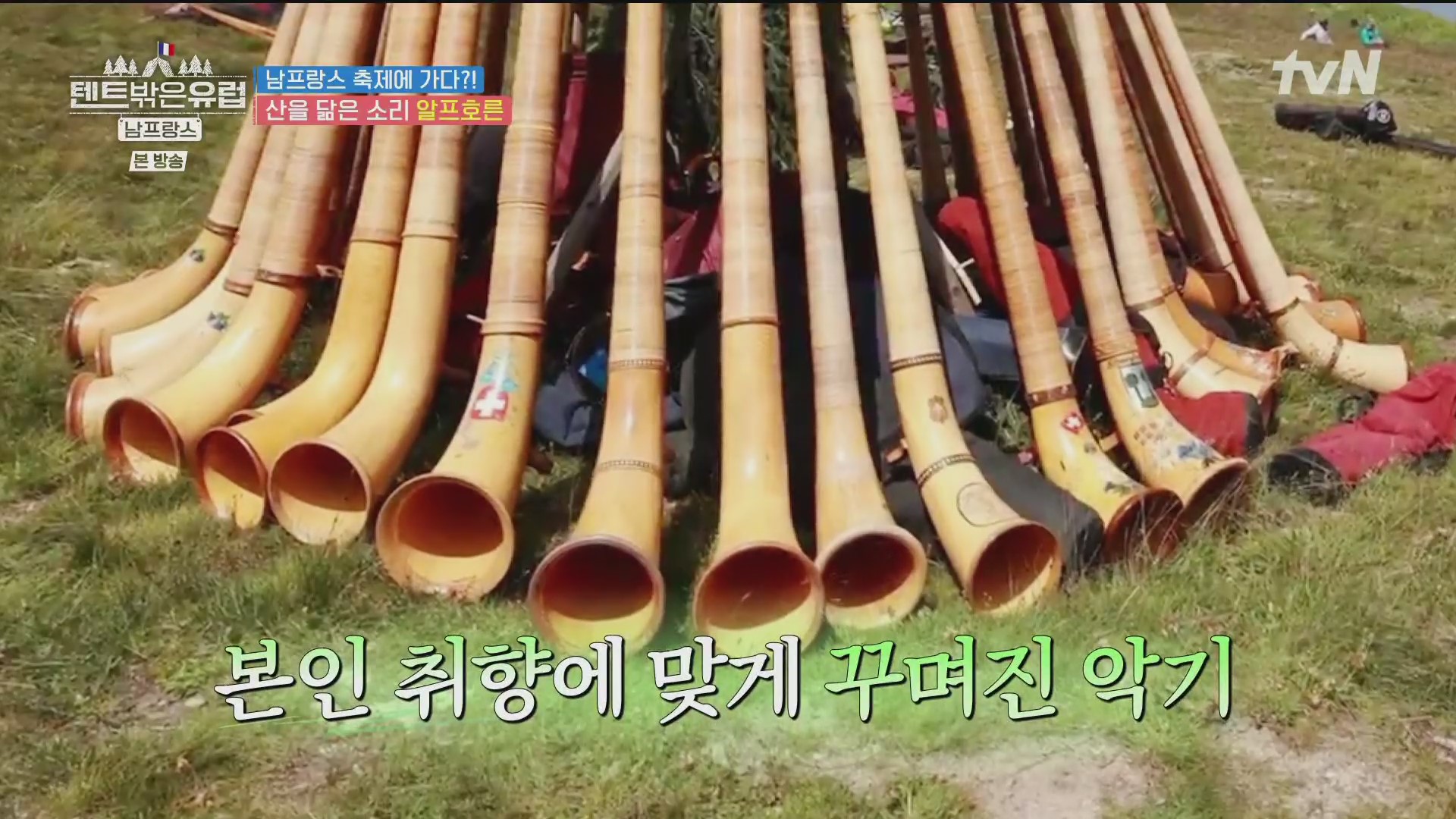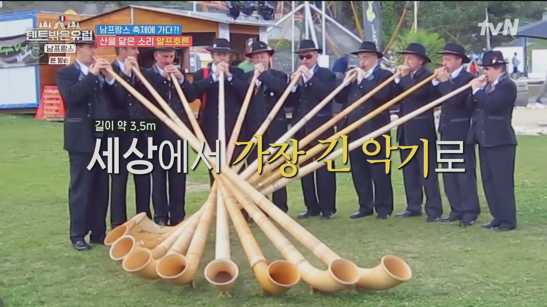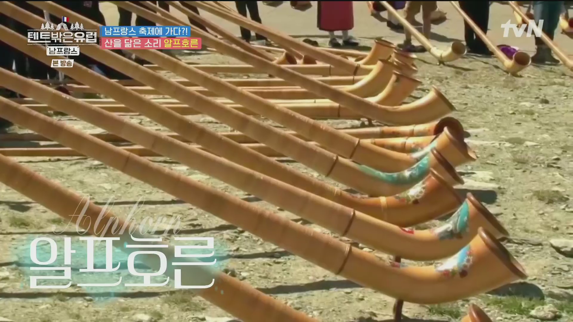4인방은 인근의 마트에 들러 필요한 식품을 구입해 지트로 돌아오면서 전통악기 알프호른을 연주하는 일단의 사람들을 만났습니다. 알프호른은 알프스 지방 주민이나 양치기들이 연주하는 긴 호른으로 세상에서 가장 긴 악기이며 과거 목동들의 의사소통 수단이었습니다. 유럽 각지에서 알프호른 축제를 개최하는데, 현재 이 마을도 축제 중입니다.