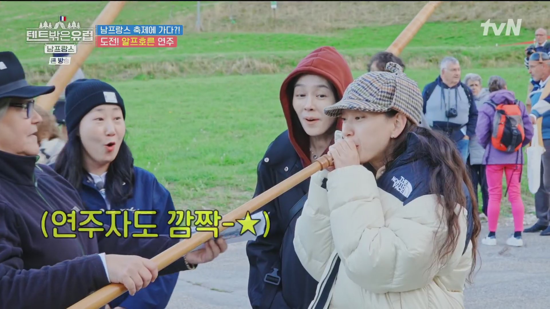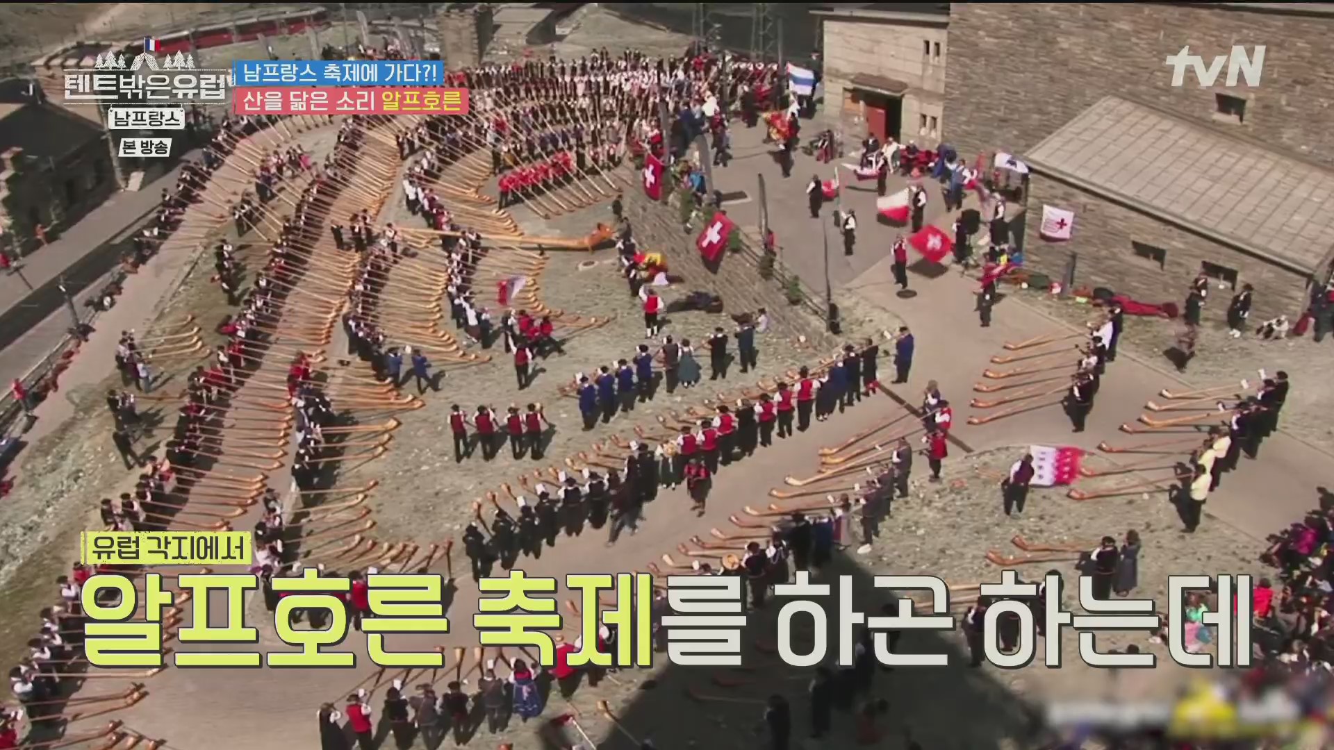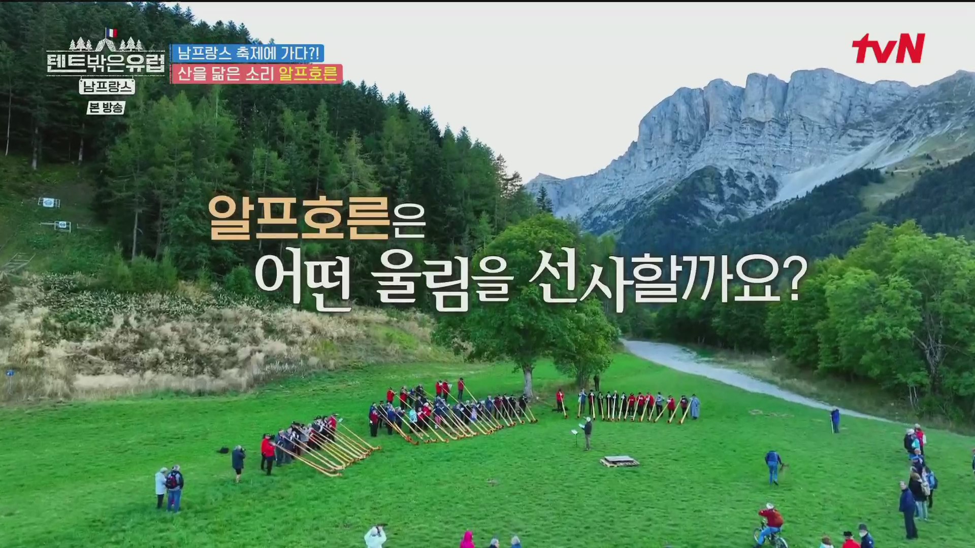 4인방은 인근의 마트에 들러 필요한 식품을 구입해 지트로 돌아오면서 전통악기 알프호른을 연주하는 일단의 사람들을 만났습니다. 알프호른은 알프스 지방 주민이나 양치기들이 연주하는 긴 호른으로 세상에서 가장 긴 악기이며 과거 목동들의 의사소통 수단이었습니다. 유럽 각지에서 알프호른 축제를 개최하는데, 현재 이 마을도 축제 중입니다.