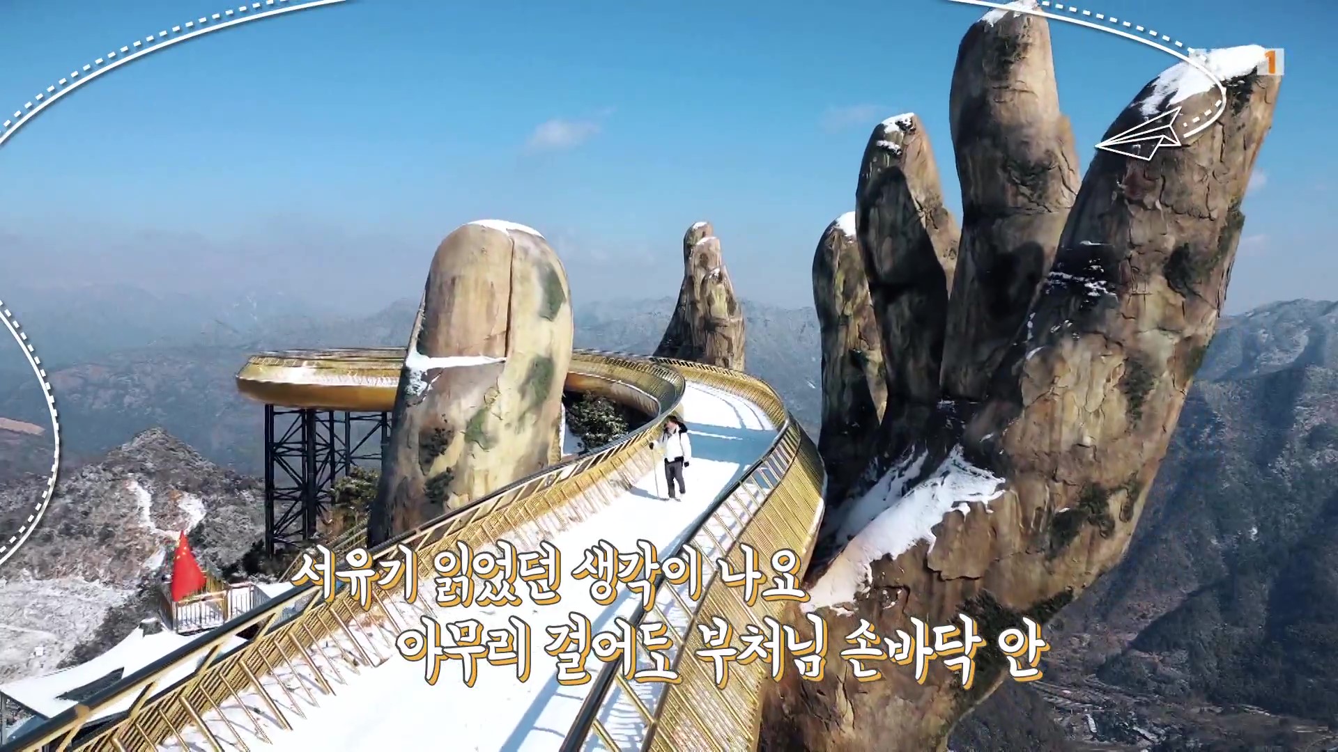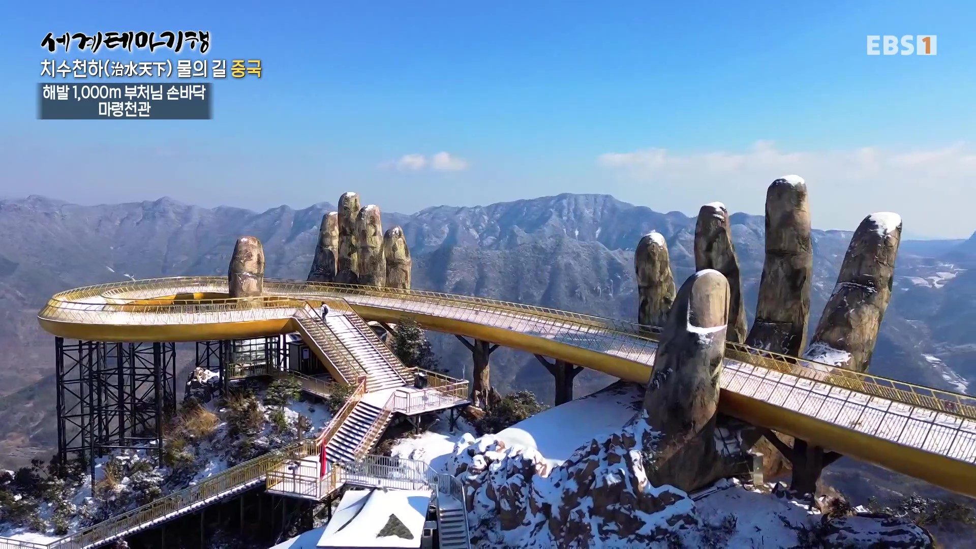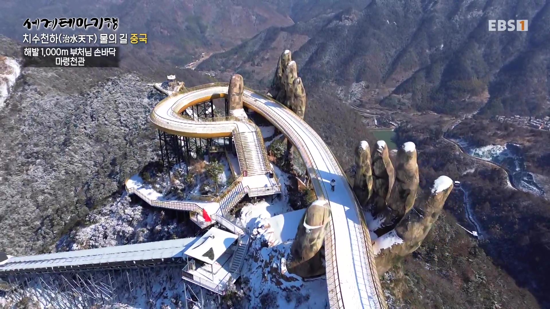 마령은 저장성 서부의 산악지역입니다. 산악길인 마령고도를 따라 오릅니다. 한참 걷다가 급경사 구간에는 컨베이어벨트 같은 미끄럼틀인 전동구름다리를 타고 오릅니다. 마령고도는 해발고도 1천 미터의 험준한 능선에 만든 길인데 정상의 길은 부처님 손바닥으로 떠받치고 있는 형상입니다. 이곳 마령천관은 코로나 기간 중 공사를 해 최근 개관했답니다.