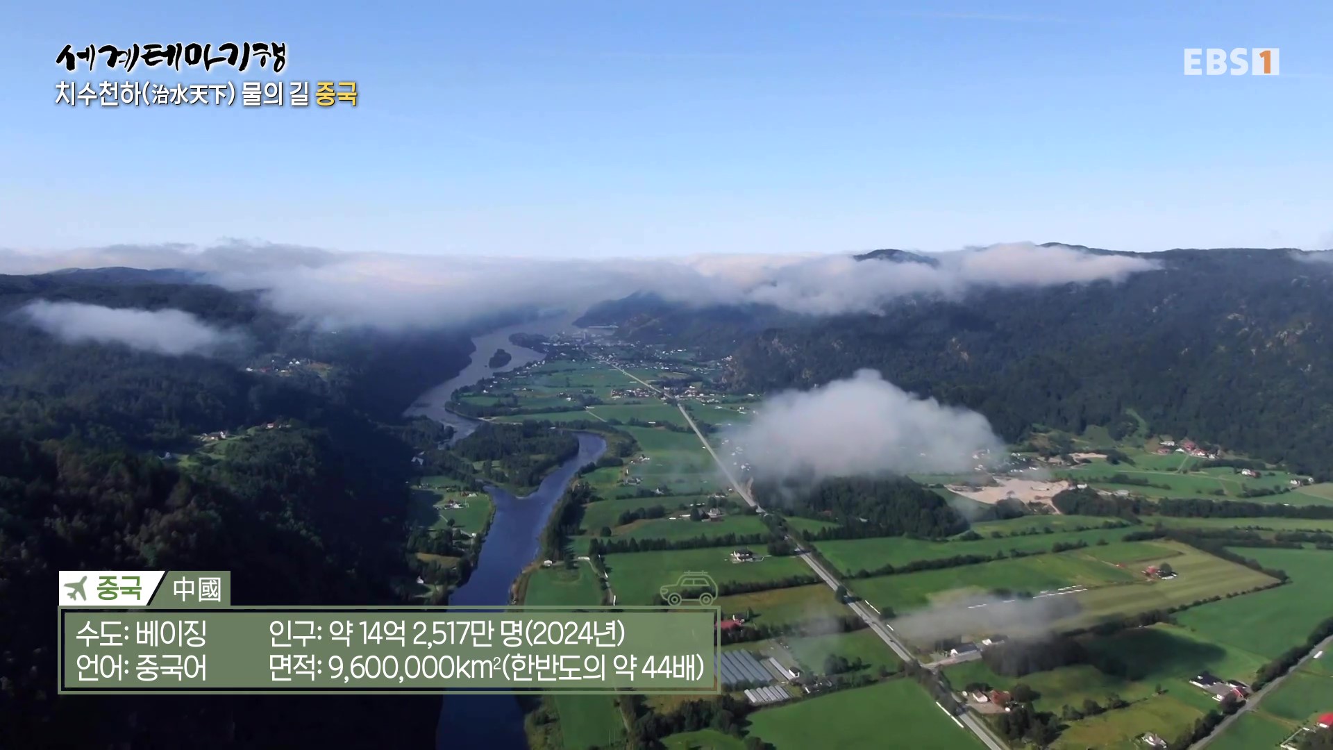 <EBS 세계테마기행>은 안방에 편안하게 앉아서 세계의 명소들을 체험할 수 있는 수준 높은 교양프로그램입니다. 각 방면에 걸쳐 다양한 지식을 가진 전문가가 출연해 실시하는 해설을 따라가노라면 실제로 해외여행을 하는 것 같은 착각에 빠지기도 합니다. 2024년 3월 중순(2024. 3. 11∼3. 14)에는 “세계테마기행, 치수천하 물의 길 중국”편이 방영되었습니다. 중국의 국토면적은 한반도의 43.4배, 인구는 약 14억 2,567만 명, 수도는 베이징입니다.