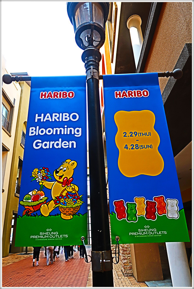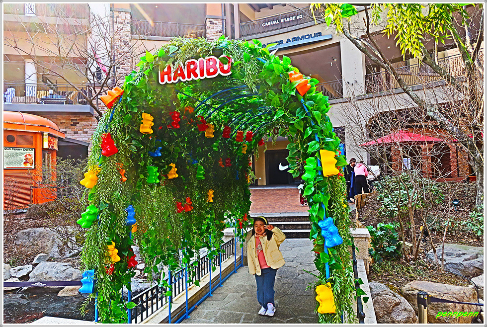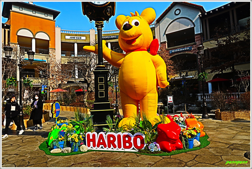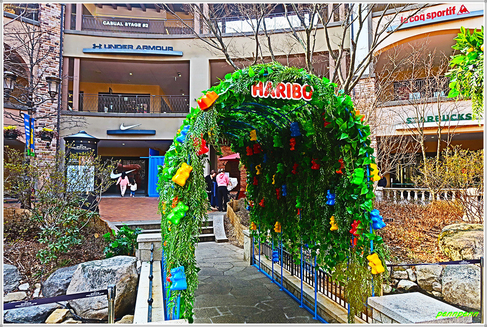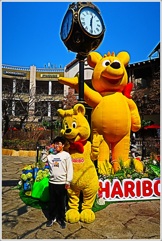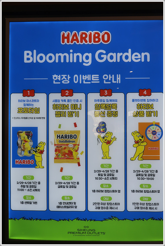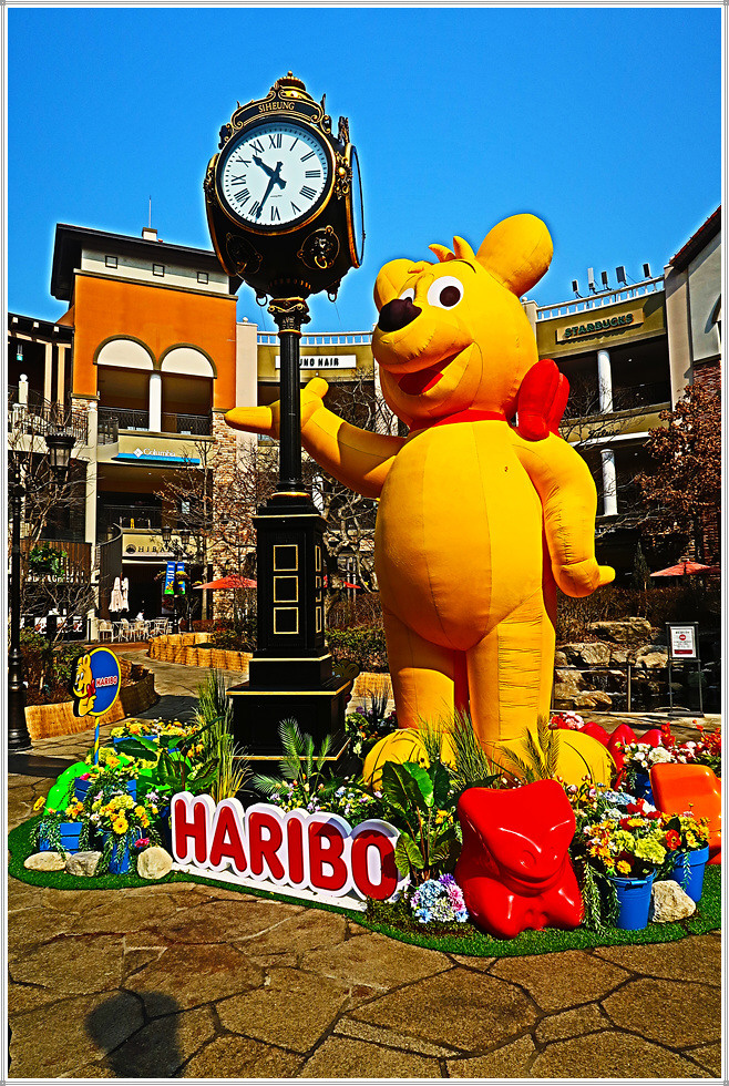 휴일을 맞아 신세계 시흥 프리미엄 아울렛을 방문했는데 주차장에서 센트럴 가든으로 들어서면 제일 먼저 대형 하리보 상징조형물인 골드베렌이 세워져 있습니다. 그 주변에는 젤리곰으로 꾸민 가든 포토존, 온실하우스, 다양한 현장 이벤트(하리보 마스코트와 즉석 사진 찍기, 하리보 미니 젤리 받기, 알록달록 풍선증정, 룰렛을 돌려 하리보 상품받기)를 진행하고 있으며 하리보관련 상품도 판매중입니다.