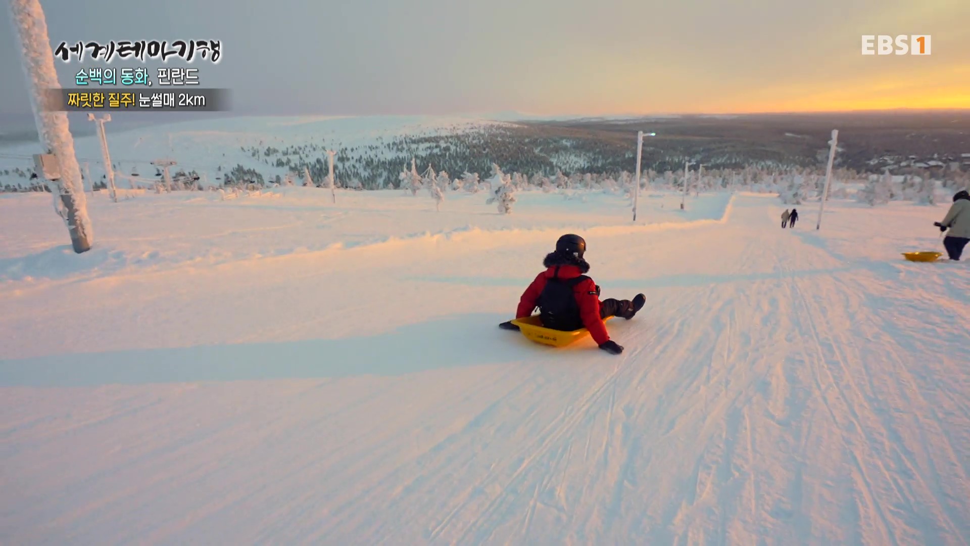 사리셀카는 평균기온이 영하10도 이하로 적설량이 많아 스키가 유명합니다. 이곳 현재 기온은 영하 15-20도입니다. 눈썰매를 타기 위해 오른 관리소와 전망대도 얼음집으로 변했습니다. 이곳에서 바라보는 환상적인 노을은 영원히 잊지 못할 것입니다. 여기서 눈썰매를 타고 2km 코스 언덕을 내려갑니다.