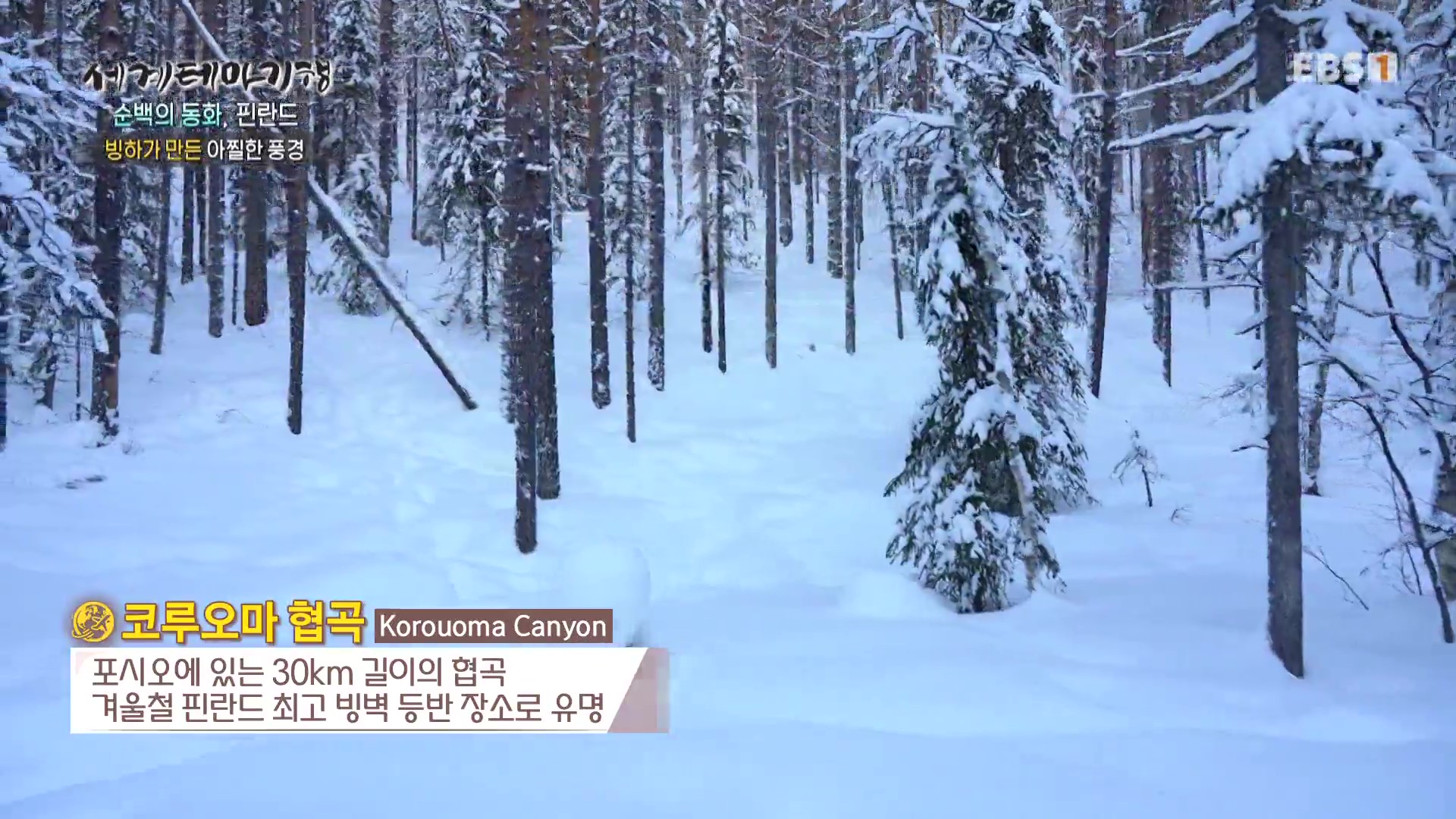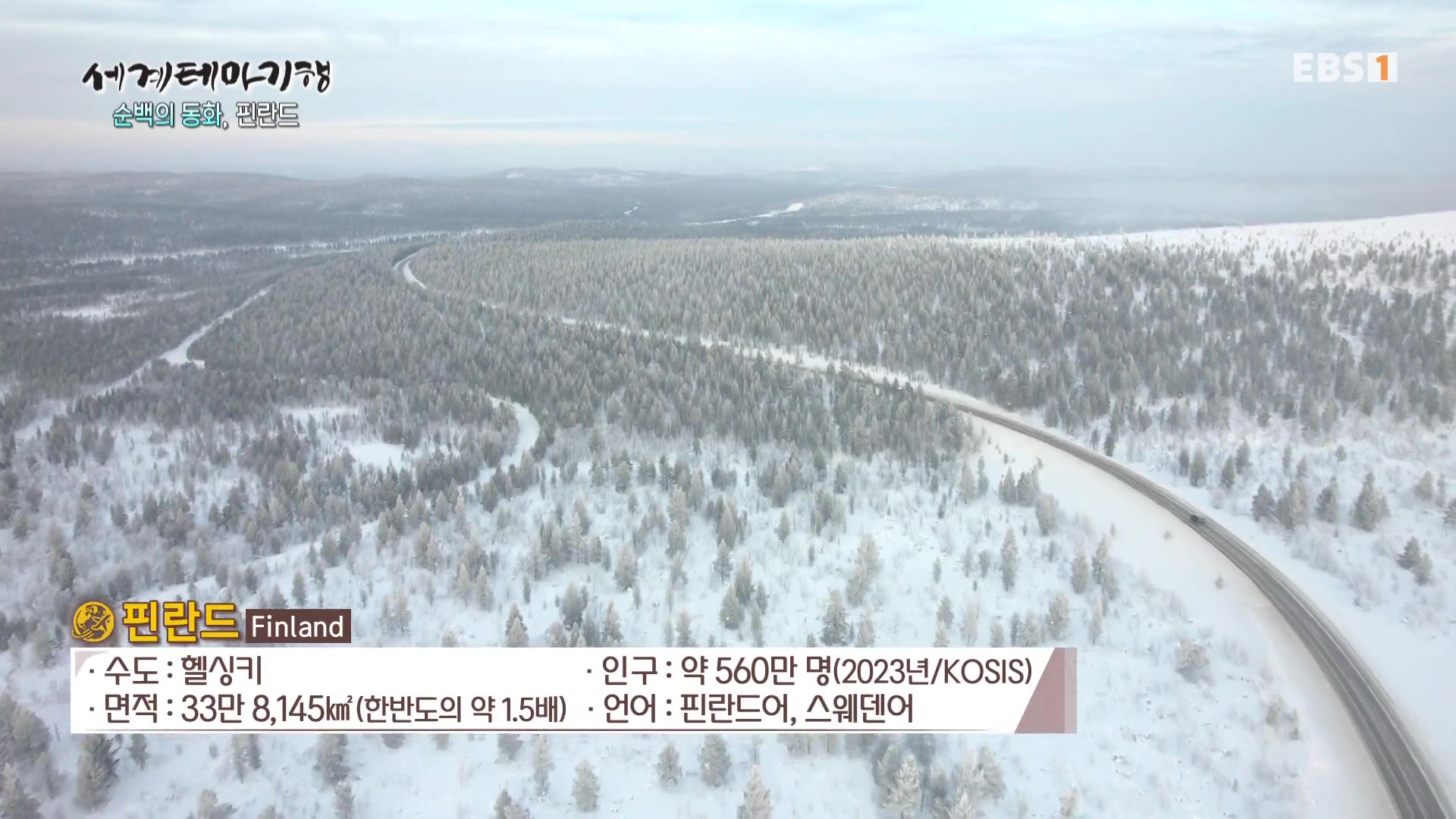 <EBS 세계테마기행>은 안방에 편안하게 앉아서 세계의 명소들을 체험할 수 있는 수준 높은 교양프로그램입니다. 각 방면에 걸쳐 다양한 지식을 가진 전문가가 출연해 실시하는 해설을 따라가노라면 실제로 해외여행을 하는 것 같은 착각에 빠지기도 합니다. 2024년 3월 중하순(2024. 3. 18∼3. 21)에는 “세계테마기행, 순백의 동화 핀란드”편이 방영되었습니다. 핀란드의 국토면적은 한반도의 1.53배, 인구는 약 554만 명, 수도는 헬싱키입니다.