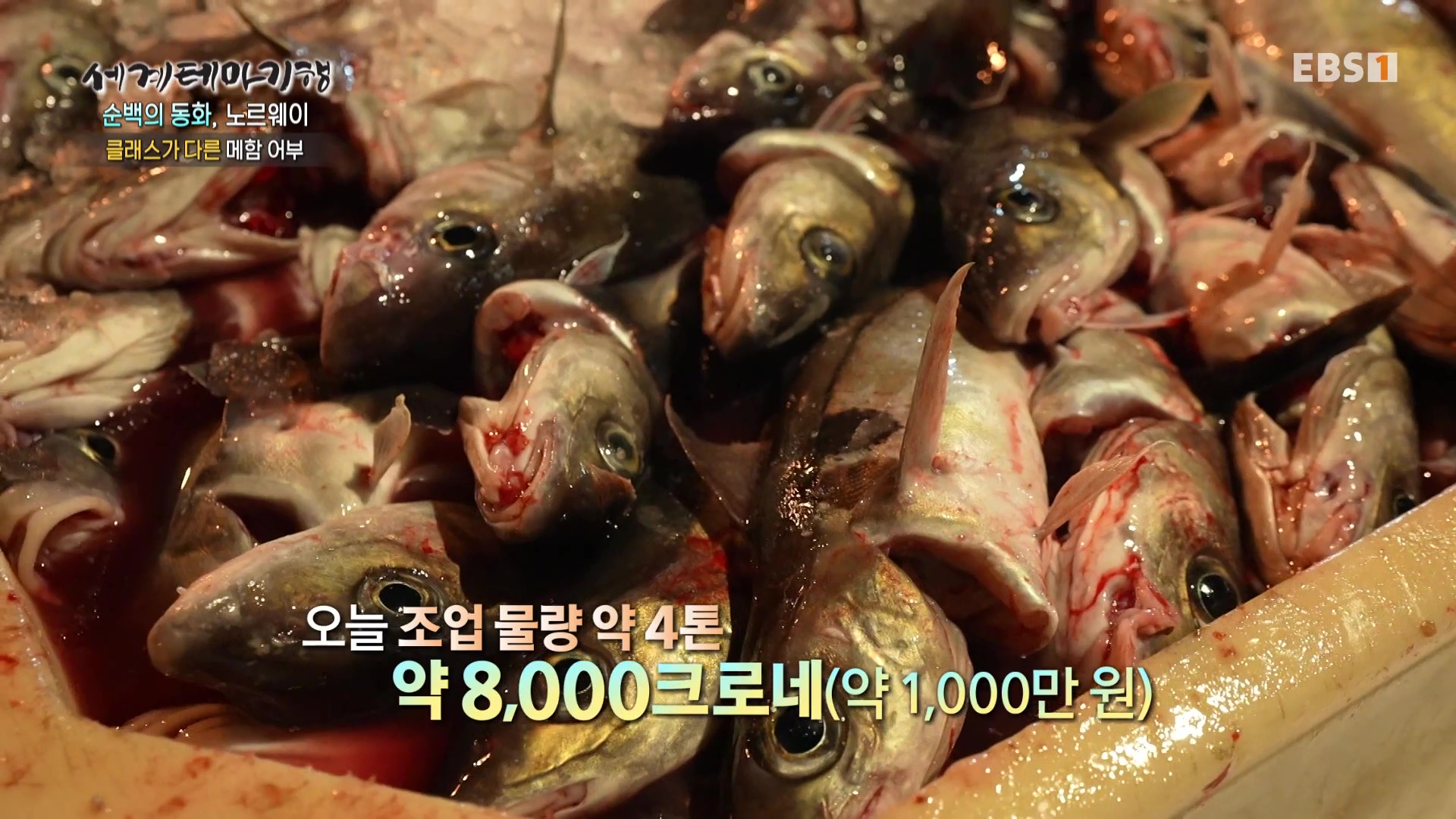 이제부터 그물을 끌어 올리는데 크기가 1m 정도의 대형 물고기도 여러 마리입니다. 잡은 고기의 아가미 쪽을 잘라 피를 뽑아야 맛이 좋답니다. 오늘 8시간 조업 끝에 약 4,400kg의 고기를 잡았습니다. 엄청난 수확이로군요. 금액으로 약 1,000만원 상당입니다. 이 생선은 가공공장을 거쳐 전 세계로 수출됩니다.