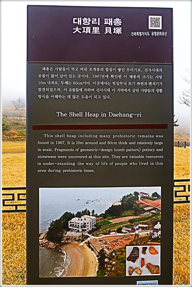 아쉬운 마음을 달래며 변산로를 따라 북쪽으로 갑니다. 서해랑길 공식 이정표가 보이는 곳에서 좌측으로 내려서면 대항리 패총(사람들이 먹고 버린 조개류의 껍질이 쌓인 무더기)입니다. 변산면 대항리 소재 대항리 패총은 신석기에서 청동기시대에 걸치는 서해안지역의 전형적인 조개더미 유적으로 패각의 분포 상태로 보아 규모가 컸던 것으로 추정됩니다. 출토유물은 즐문토기(櫛文土器: 빗살무늬토기)와 무문토기(無文土器: 민무늬토기), 석기류 등이 있으며, 정식 발굴조사가 이루어지지 않아 유적의 형성 시기와 성격은 분명하지 않지만 조개더미의 범위는 사방 10m내외로 패각층 두께는 50~60㎝ 정도입니다. 다만 필자 같은 비전문가가 육안으로 봐서는 어느 게 패총인지 잘 모르겠습니다.