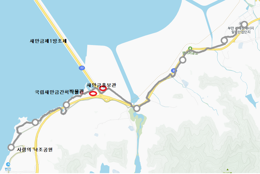 ▲ 코스 : 사랑의 낙조공원-대항리패총-국립새만금간척박물관-새만금홍보관-변산교-소광교차로-잼버리공원(경관쉼터)-신재생에너지테마파크-월포마을경노당