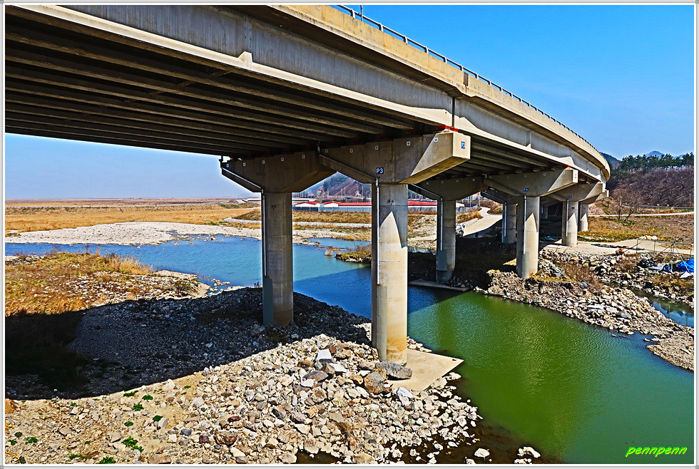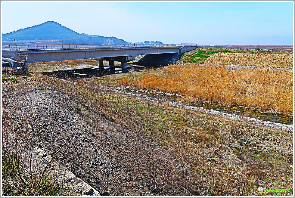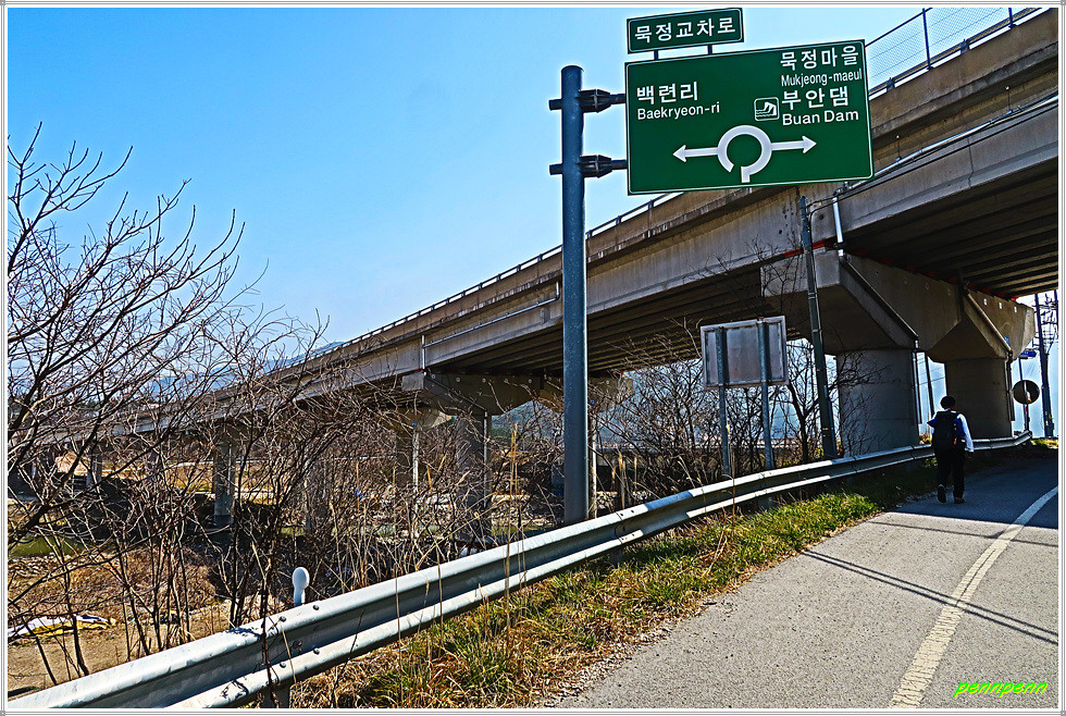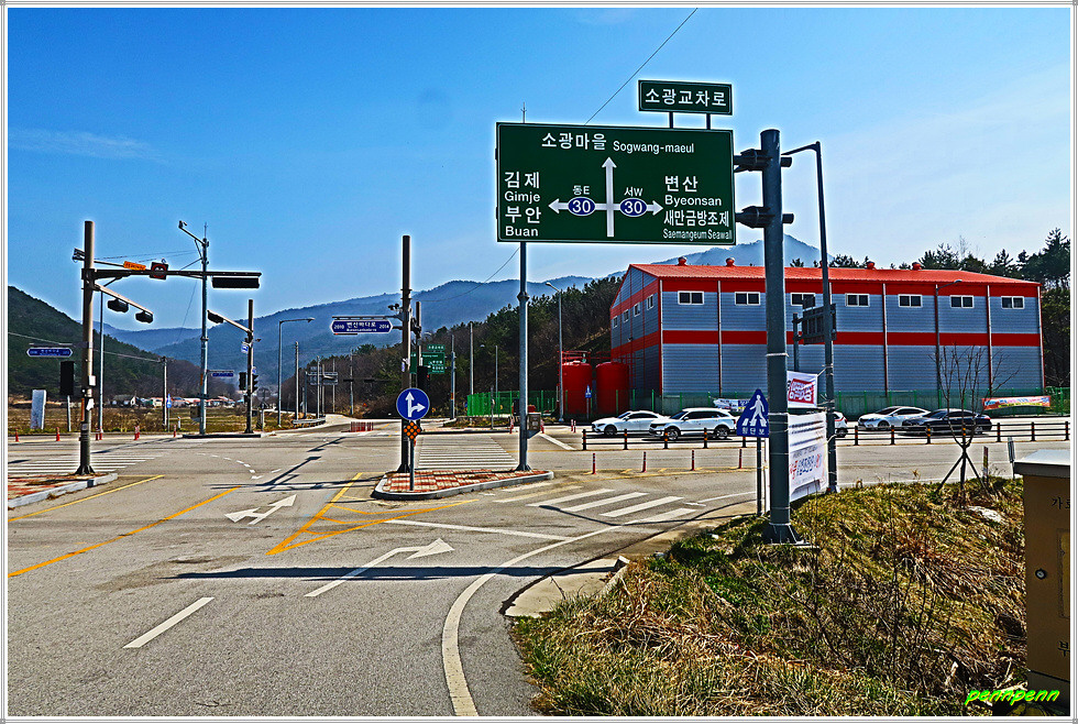 홍보관 정문에는 목련이 활짝 피었고 그 옆에는 용도를 알 수 없는 유럽식 고성 같은 건축물이 눈길을 끕니다. 홍보관교차로에서 동남쪽으로 걸어가면서 30번 국도가 지나가는 새만금교 굴다리를 통과하면 묵정교차로인데 이곳에서 직소천을 가로지르는 변산교를 건넙니다. 여기서 직소천의 물길을 따라 남쪽으로 가면서 부안댐을 지나면 내변산의 명물인 직소폭포도 만나겠군요.