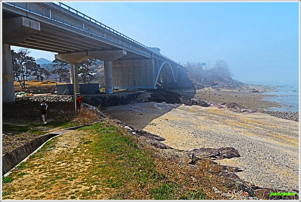 군산대학교 해양연구원을 뒤로하고 대파밭을 지나 바닷가로 내려섭니다. 안개가 서서히 걷히기 시작해 해안풍경이 조금씩 보여 다행입니다. 바닷가의 암석이 다양한 색상을 띠고 있군요. 오솔길을 지나면 또 멋진 바위군이 나타납니다. 대항교차로 옆을 지나 30번 국도의 조개미교 하부를 통과했는데, 길은 U자로 돌아 다시 조개비교 굴다리를 지나가는군요.