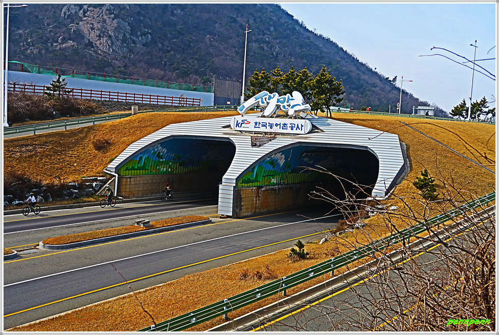 기념탑 주위에는 군산포토관광투어의 포토존을 알리는 안내판이 보이고, 새만금글씨(ㅅㅁㄱ)로 사각액자틀을 만든 게 이채롭습니다. 이곳도 역시 포토존입니다. 광장남쪽에는 신시배수갑문(신시대교)이 있고 광장서쪽에는 77번 국도가 통과하는 신시터널이 보입니다.