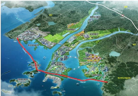 새만금방조제는 부안군 변산면 대항리에서 북쪽으로 군산시 옥도면의 가력도, 신시도, 야미도, 비응도까지 잇는 세계 최장 33.9km의 방조제로 그 안의 바다를 육지로 만들어 새로 생겨날 국토는 여의도의 140배에 달합니다. 이 사업의 위치는 전북 군산시, 김제군 및 부안군 공유수면 일원으로 방조제 축조로 거대한 가용토지 및 담수호를 조성해 배후지역의 침수를 해소하고 산업, 관광레저, 환경, 과학 등 복합개발을 하는 대규모 국책사업입니다.