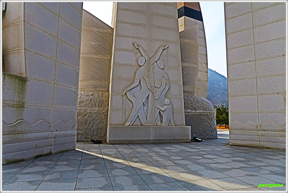 신시광장 주차장에 들어서면 기념탑이 우뚝합니다. 일반적으로 이런 기념탑에는 전면에 이를 알리는 글씨가 있기 마련인데 글씨도 없고 또 기념탑 자체에 대한 안내문이 없어 기념탑의 조형물이 무엇을 상징하는지 알 수가 없습니다. 다만 뒤쪽에는 사업개요와 추진경위 등이 석판에 자세하게 기록되어 있습니다.