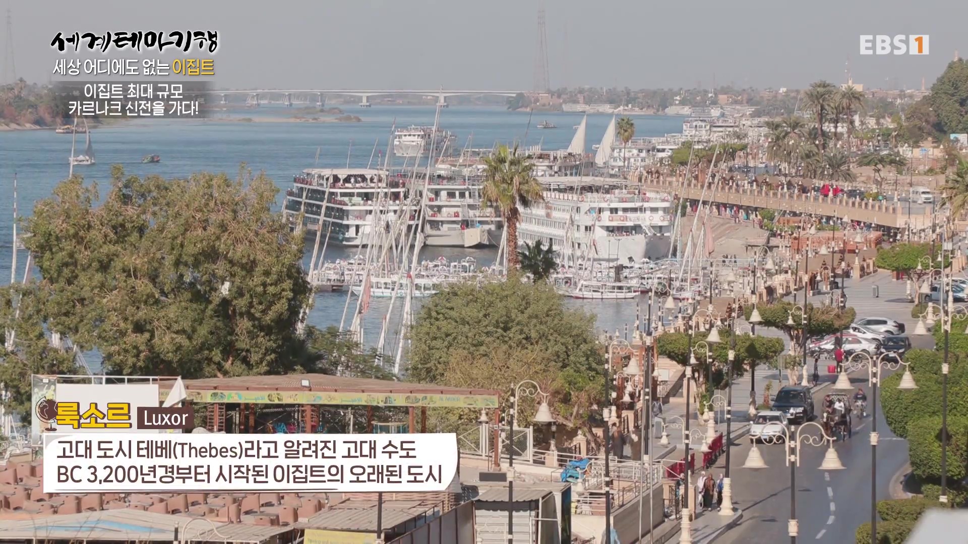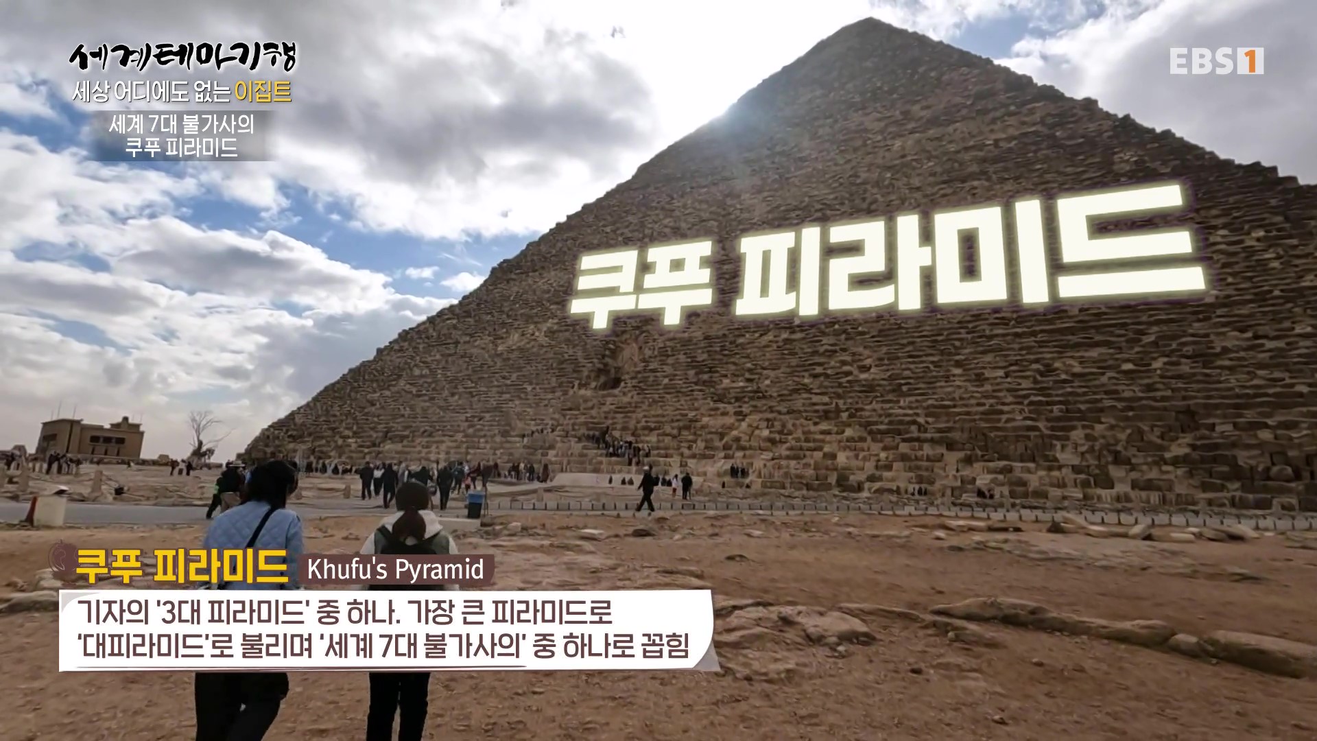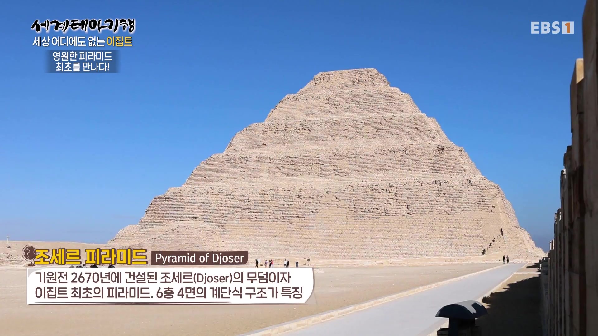 <EBS 세계테마기행>은 안방에 편안하게 앉아서 세계의 명소들을 체험할 수 있는 수준 높은 교양프로그램입니다. 각 방면에 걸쳐 다양한 지식을 가진 전문가가 출연해 실시하는 해설을 따라가노라면 실제로 해외여행을 하는 것 같은 착각에 빠지기도 합니다. 2024년 3월 하순(2024. 3. 25∼3. 28)에는 “세계테마기행, 세상 어디에도 없는 이집트”편이 방영되었습니다. 이집트의 국토면적은 한반도의 약 4.5배, 인구는 1억 1,271만 명, 수도는 카이로입니다.