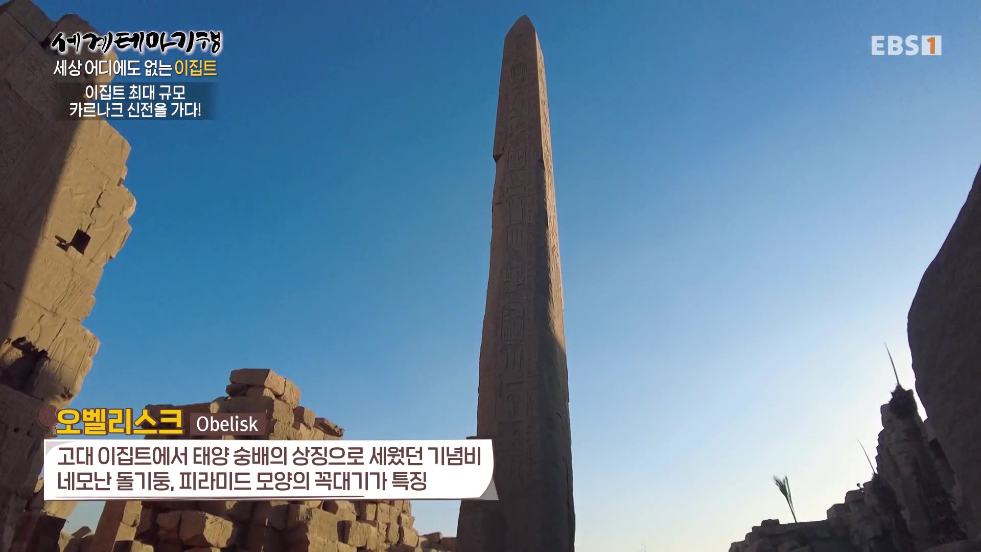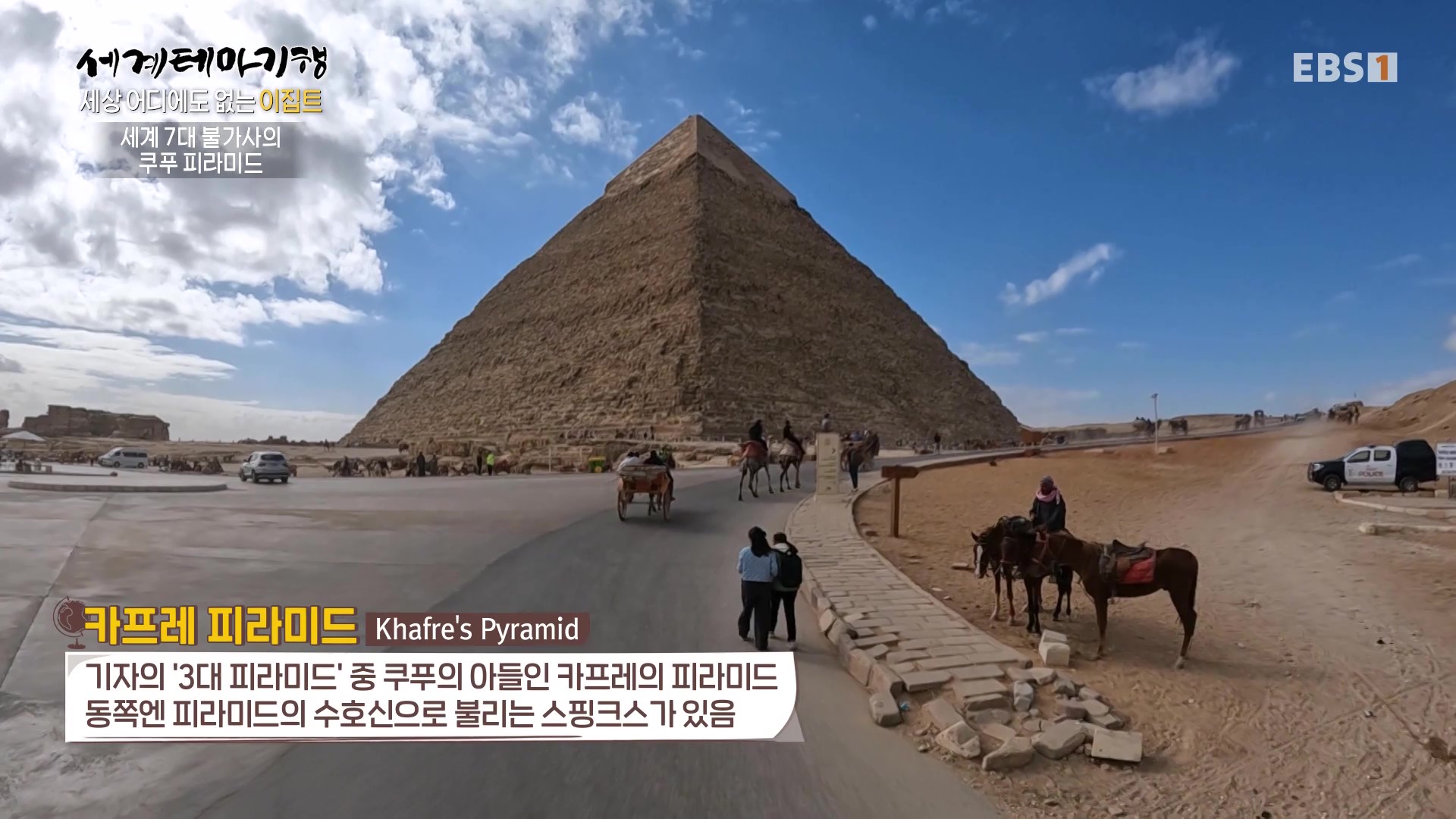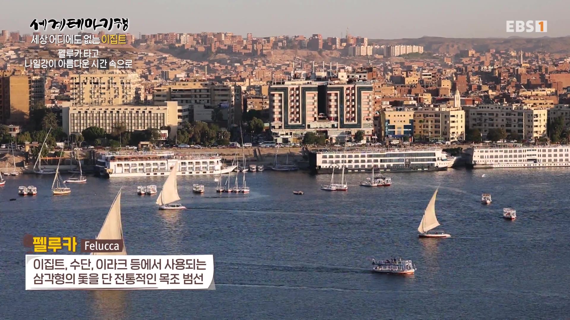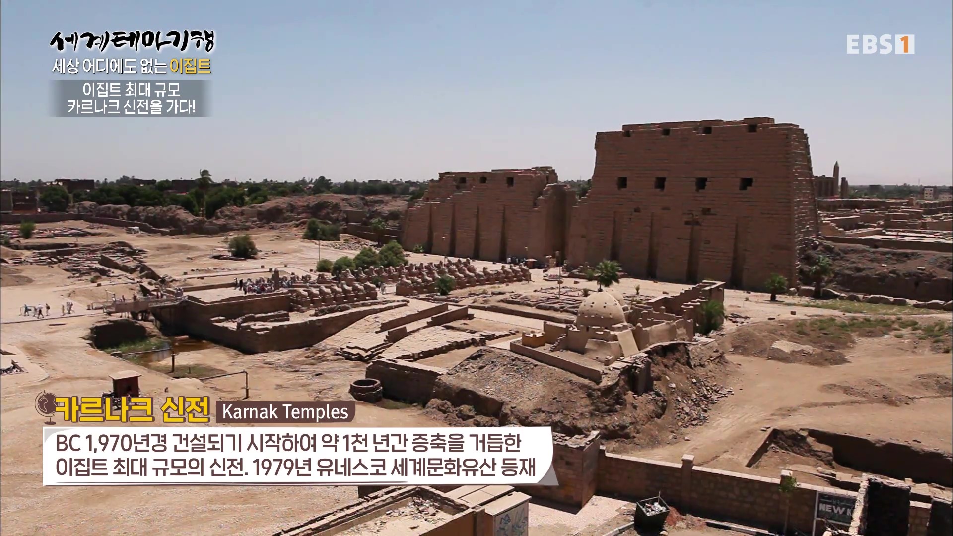 <EBS 세계테마기행>은 안방에 편안하게 앉아서 세계의 명소들을 체험할 수 있는 수준 높은 교양프로그램입니다. 각 방면에 걸쳐 다양한 지식을 가진 전문가가 출연해 실시하는 해설을 따라가노라면 실제로 해외여행을 하는 것 같은 착각에 빠지기도 합니다. 2024년 3월 하순(2024. 3. 25∼3. 28)에는 “세계테마기행, 세상 어디에도 없는 이집트”편이 방영되었습니다. 이집트의 국토면적은 한반도의 약 4.5배, 인구는 1억 1,271만 명, 수도는 카이로입니다.