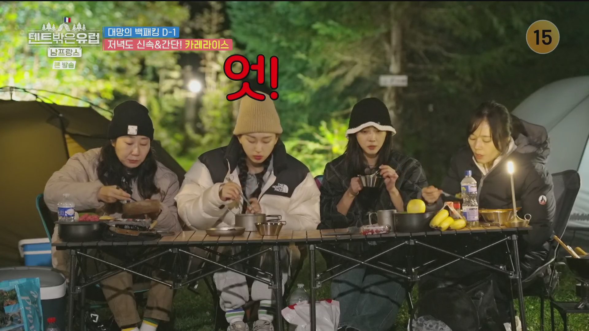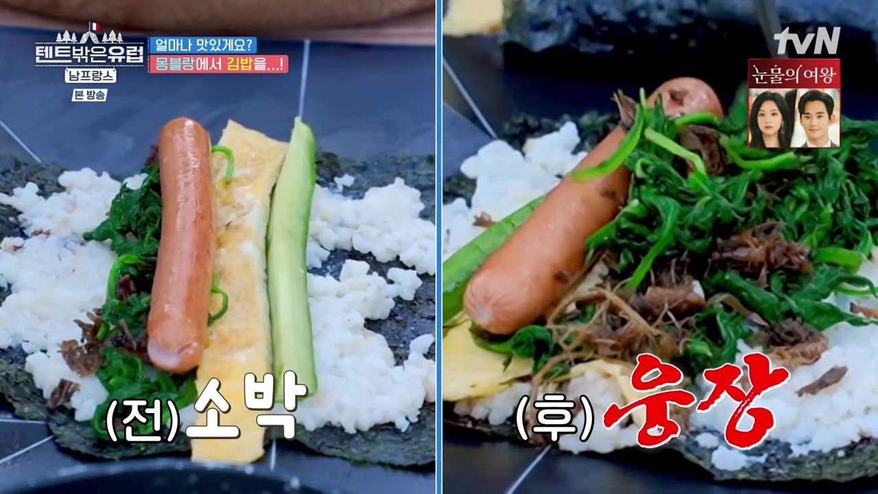 캠핑장은 전원마을 같은 곳에 자리 잡고 있습니다. 이들은 텐트를 친 다음 김치찌개와 소시지배추볶음을 요리해 밥과 함께 먹은 후 후식으로 양념치킨까지 맛보고는 잠을 청합니다. 이튿날 기상해보니 캠핑장 주변은 운무(안개구름)로 인해 구름바다로 변했습니다. 라미란은 몽블랑으로 가서 먹을 식사용 김밥을 준비하는군요. 이들은 다시 짐을 챙겨 유럽의 알프스인 몽블랑을 볼 수 있는 샤모니로 떠납니다.