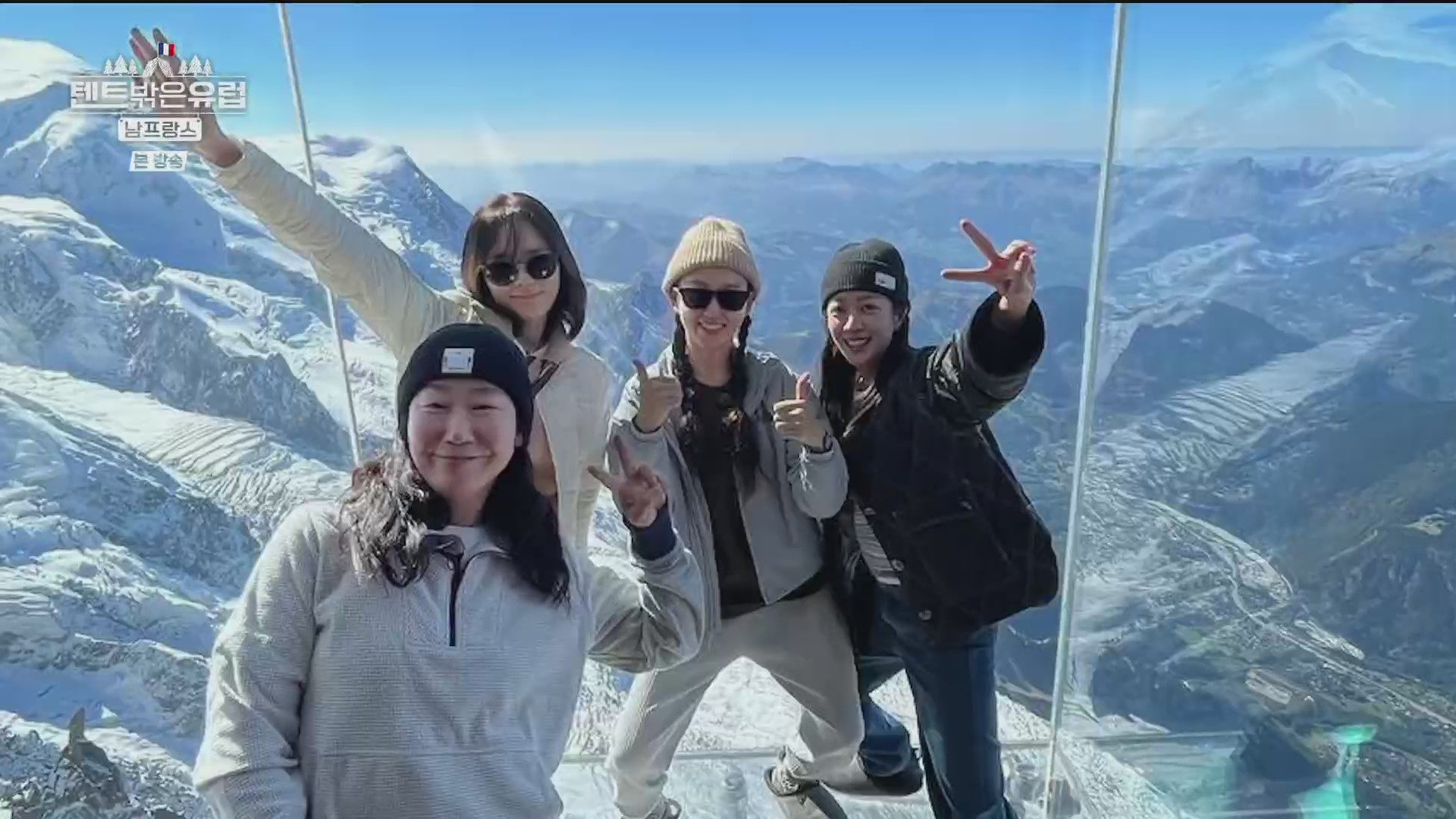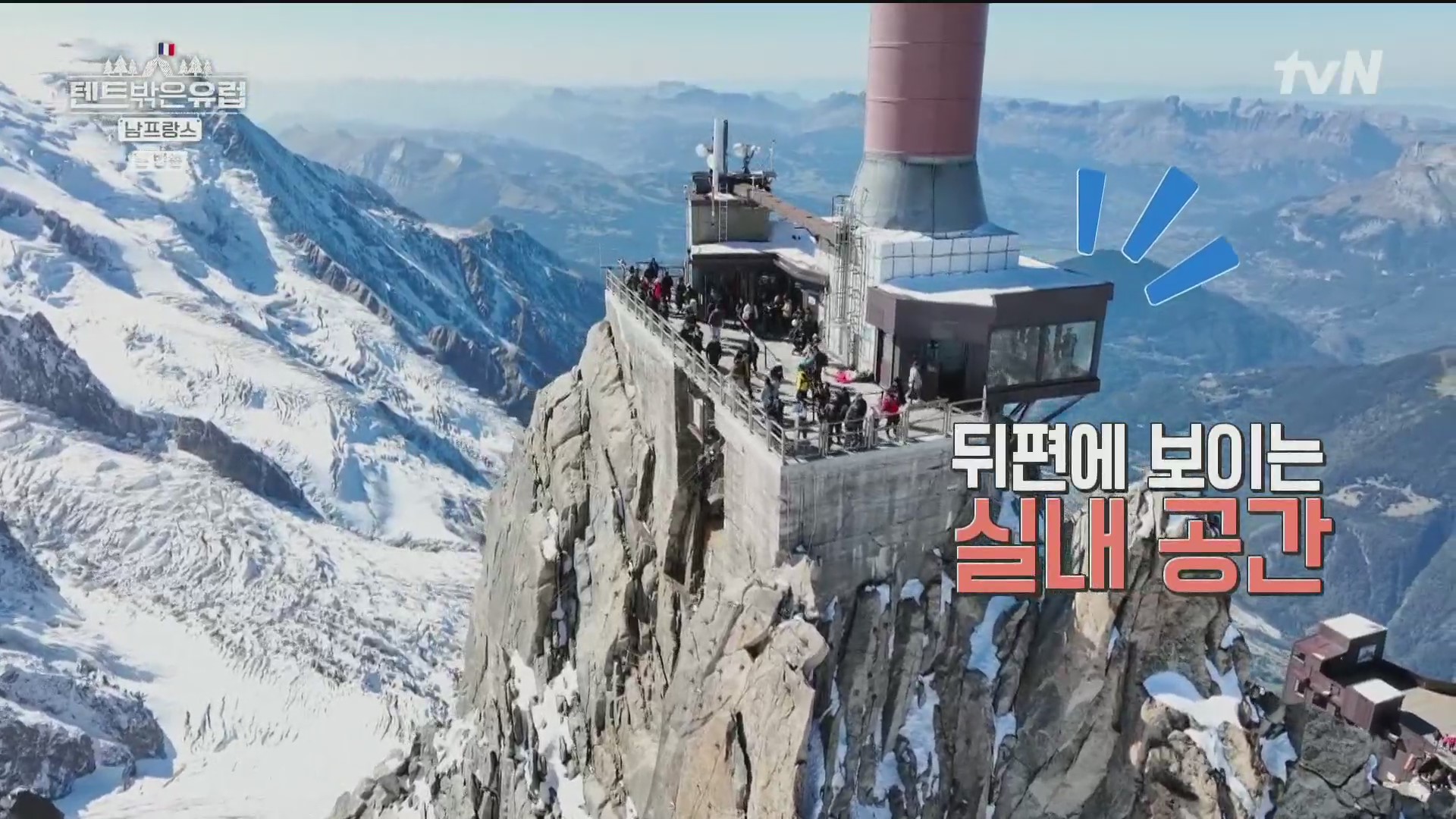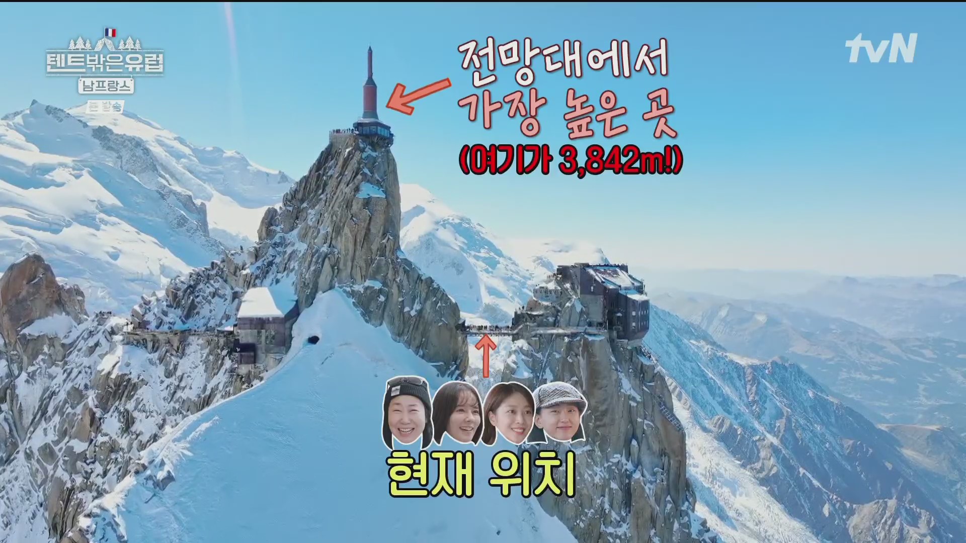 사진찰영을 끝으로 이들은 샤모니로 내려가기로 합니다. 이 때 일행 중 조보아가 고산병증세로 약간 숨쉬기가 힘들다며 어려움을 호소하네요. 에귀 디 미디의 경우 고도가 높아 산소의 농도가 65%에 불과해 조심해야 합니다. 그런데 이 장면을 보니 필자(pennpenn)가 33년 전인 1991년 가족(아내와 두 아들)과 함께 이곳에 올라 케이블카에서 내리자마자 고산병 증세로 인한 호흡곤란과 어지러움으로 견디기가 힘들어 구름다리도 건너지 못한 채 그냥 내려간 쓰라진 추억이 떠오릅니다. 스위스 융프라우(최고봉 4,158m, 산악열차 3,454m)의 경우 산악열차를 타고 천천히 오르므로 고도상승에 적응할 수 있지만 이곳 몽블랑의 경우에는 케이블카로 확 오르므로 고도가 갑자기 높아지기 때문입니다.