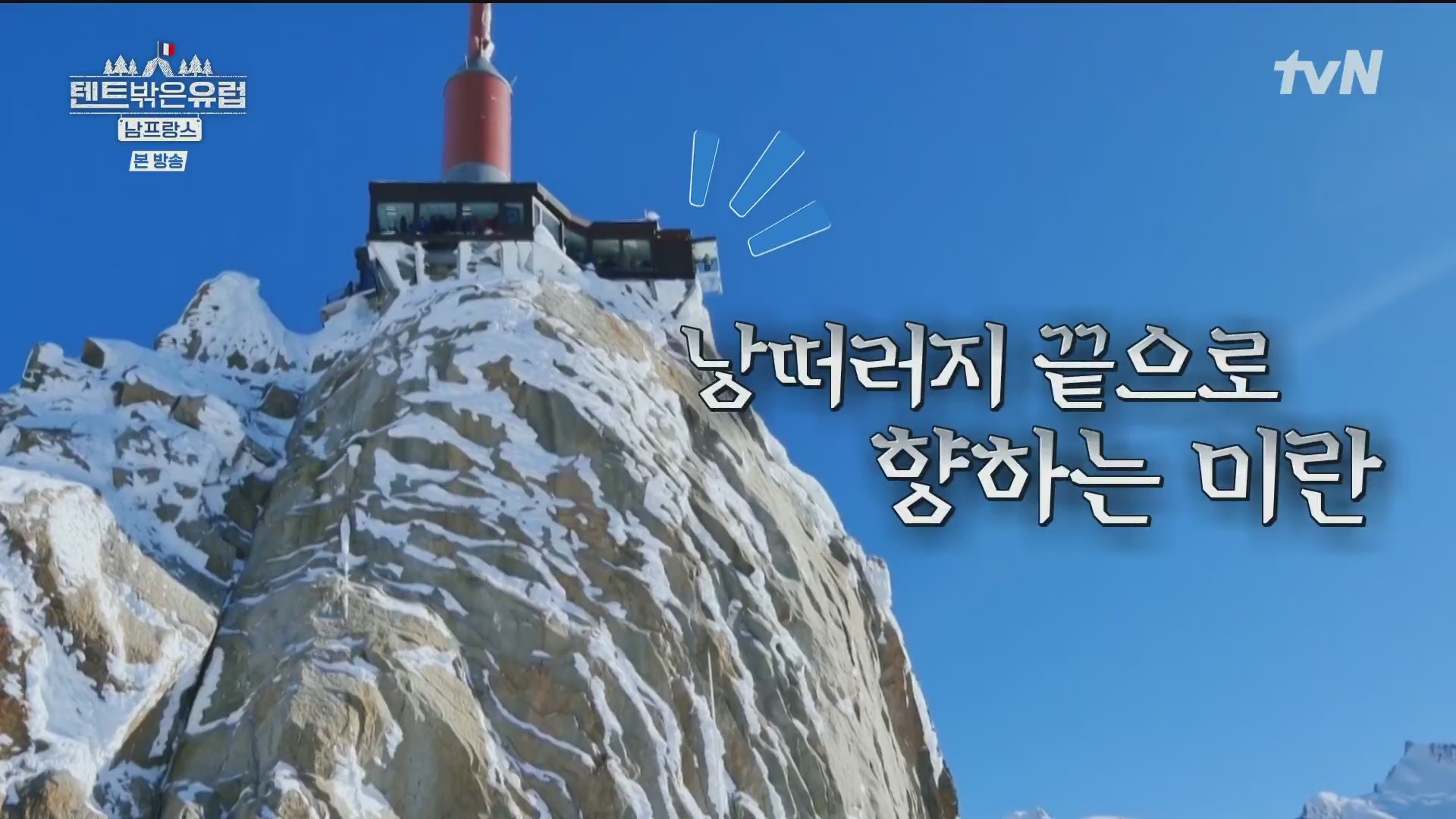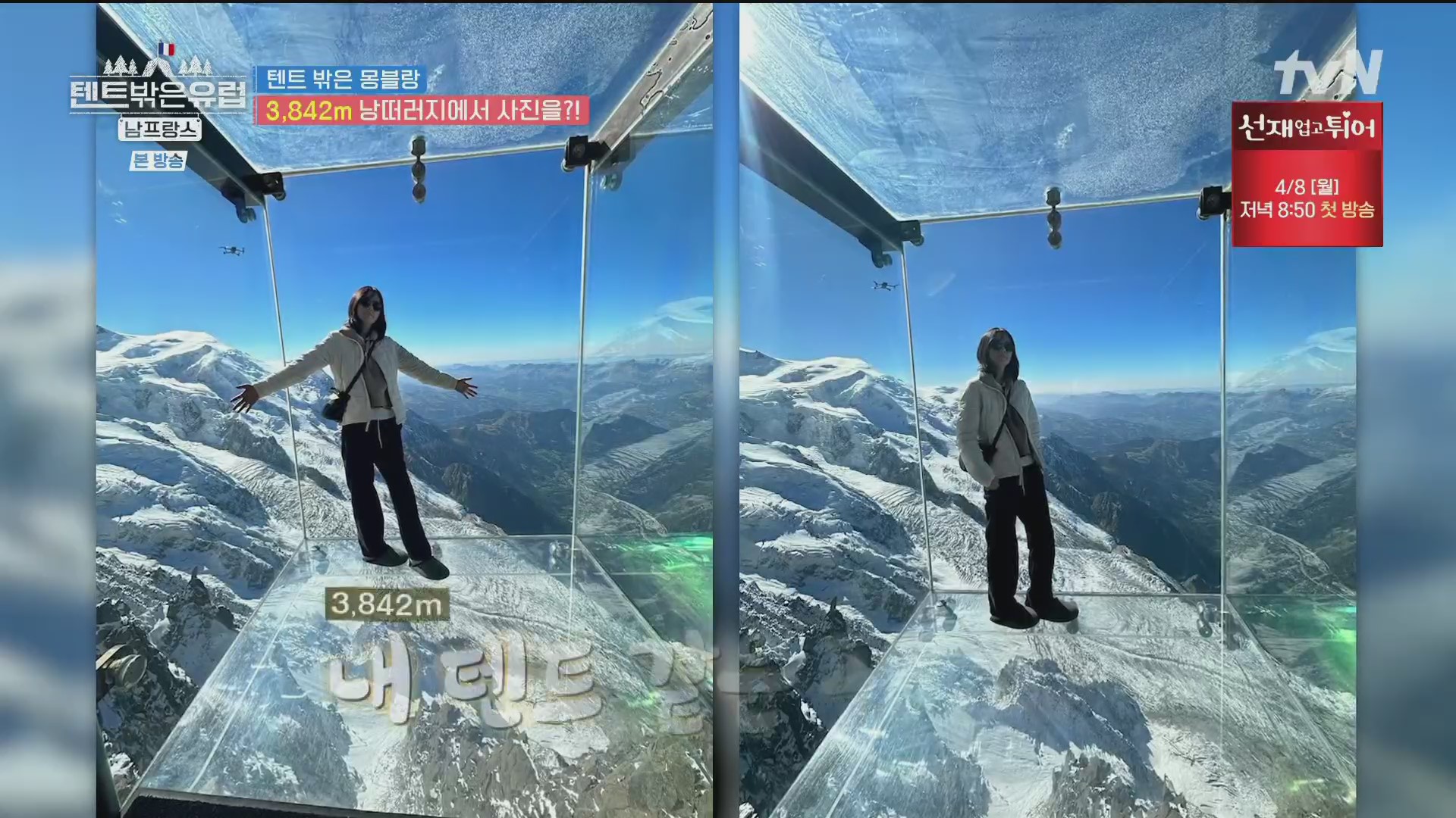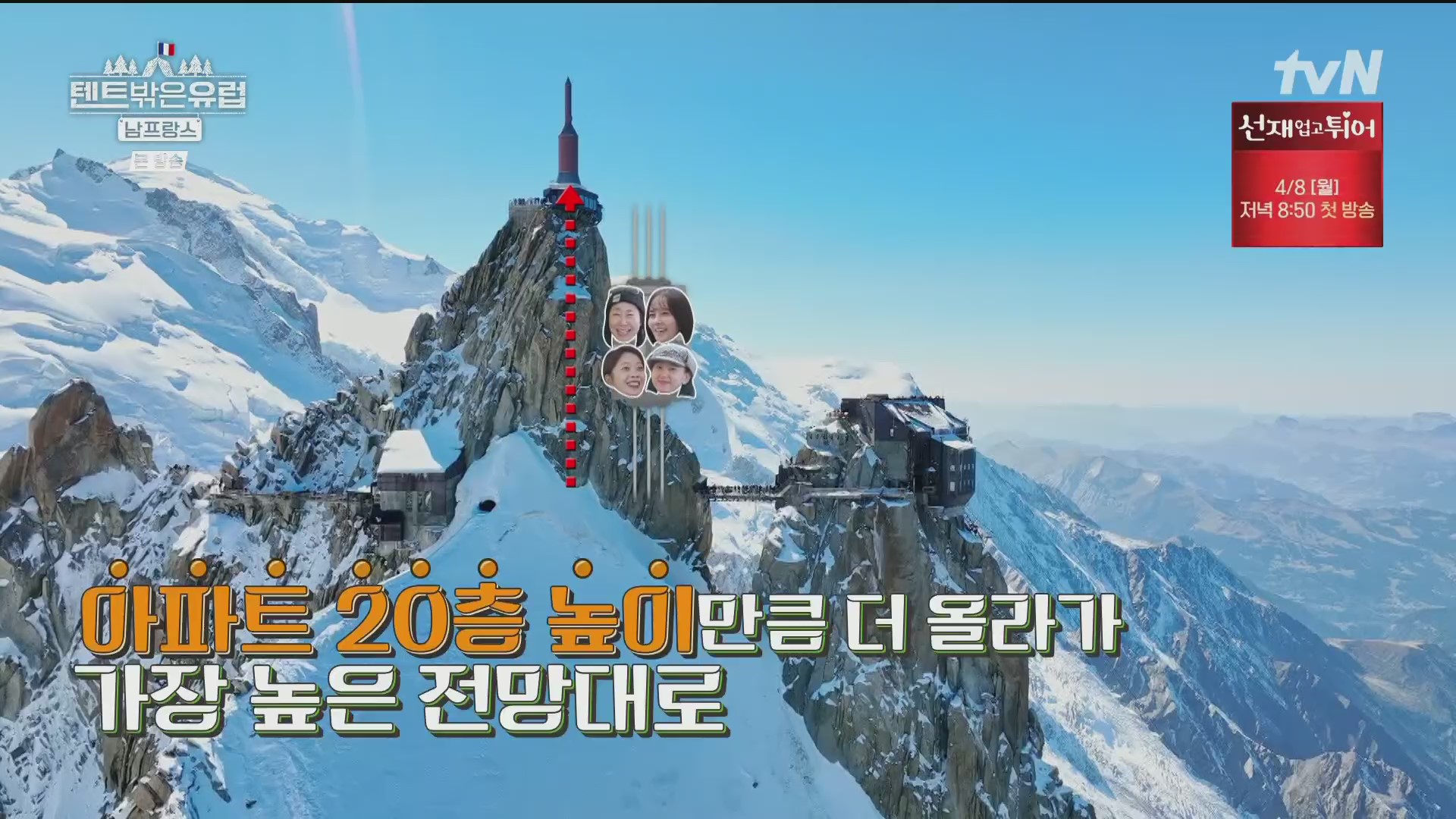 사진찰영을 끝으로 이들은 샤모니로 내려가기로 합니다. 이 때 일행 중 조보아가 고산병증세로 약간 숨쉬기가 힘들다며 어려움을 호소하네요. 에귀 디 미디의 경우 고도가 높아 산소의 농도가 65%에 불과해 조심해야 합니다. 그런데 이 장면을 보니 필자(pennpenn)가 33년 전인 1991년 가족(아내와 두 아들)과 함께 이곳에 올라 케이블카에서 내리자마자 고산병 증세로 인한 호흡곤란과 어지러움으로 견디기가 힘들어 구름다리도 건너지 못한 채 그냥 내려간 쓰라진 추억이 떠오릅니다. 스위스 융프라우(최고봉 4,158m, 산악열차 3,454m)의 경우 산악열차를 타고 천천히 오르므로 고도상승에 적응할 수 있지만 이곳 몽블랑의 경우에는 케이블카로 확 오르므로 고도가 갑자기 높아지기 때문입니다.