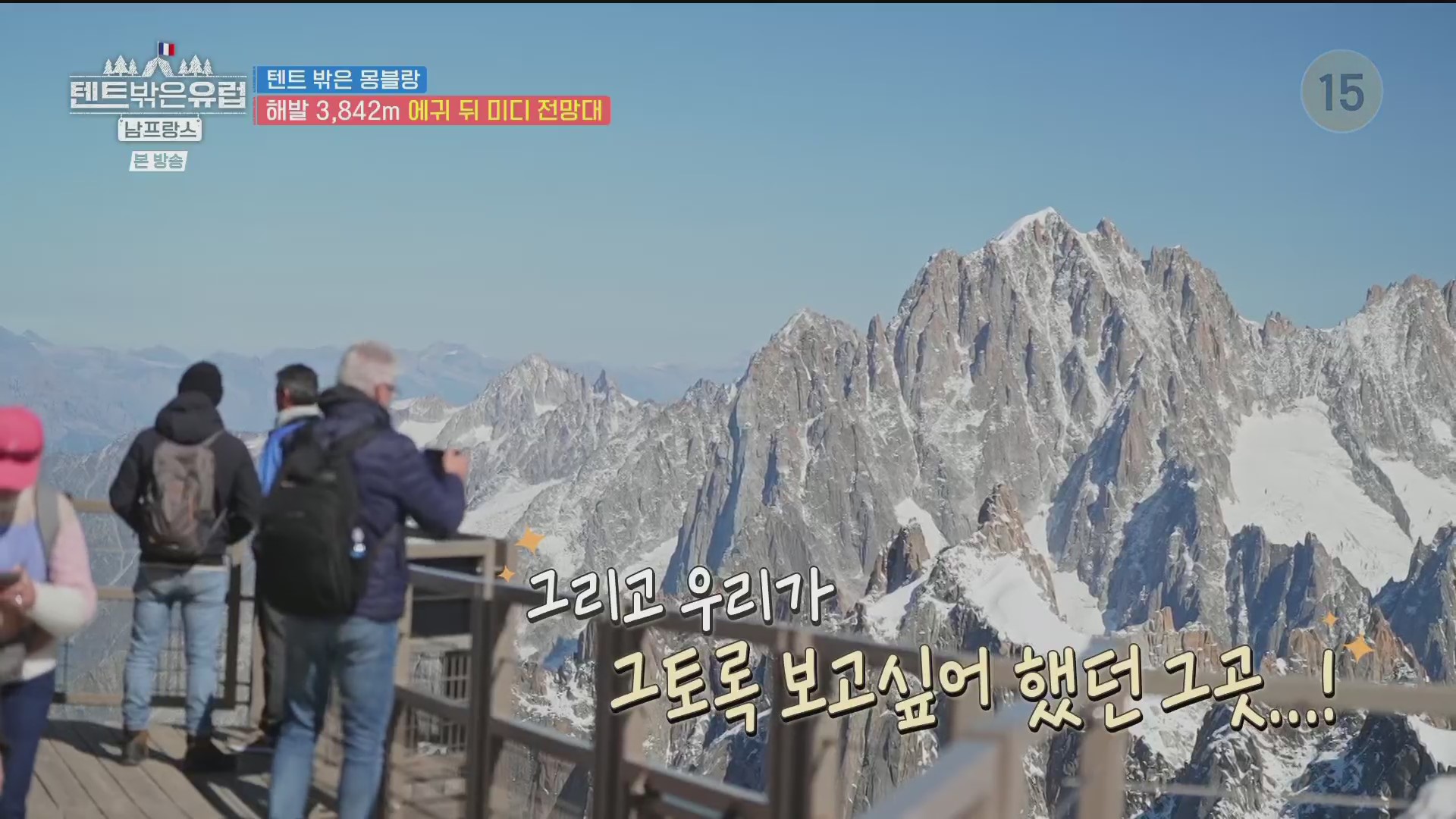 이날 몽블랑의 날씨는 바람도 없고 깨끗해 알프스의 위용을 선명하게 볼 수 있습니다. 케이블카 승강장(3,777m)에서 구름다리를 건너 엘리베이터를 타면 아파트 20층 높이의 더 높은 꼭대기(3,842m)로 오를 수 있습니다. 이들은 드디어 한라산 높이의 약 두 배인 에귀 디 미디 정상에 우뚝 섭니다. 이곳에서니 설산으로 변한 알프스 연봉들이 파노라마처럼 펼쳐집니다.