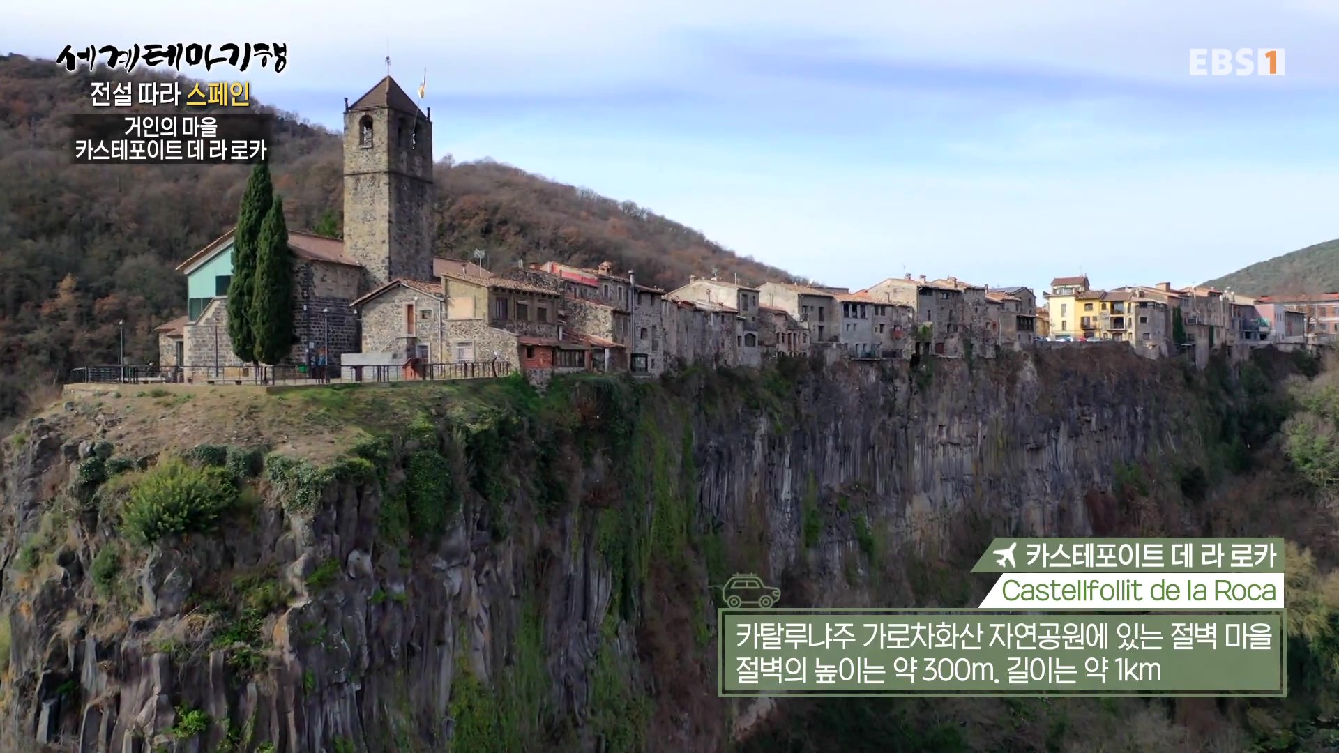 카스테포이트 데 라 로카는 카탈루냐주 가로차 화산 자연공원에 있는 절벽마을로 절벽의 높이는 약 300m, 길이는 1km에 달합니다. 절벽 위에 다닥다닥 지은 주택들은 보기에도 정말 아찔하군요. 마을의 거인광장에는 두 거인의 사진이 붙어 있는데 거인 중 록은 죽고 바르바라는 어디에 살아 있는지 아무도 모른다는 전설이 있답니다. 마을이 언제 생성되었는지는 모르지만 문헌에 의하면 11세기 때 기록이 존재한다는군요. 현지 주민에 의하면 이곳은 화산이 많은 곳이라서 화산폭발로 용암이 흘러 이와 같은 지형을 만들었다고 합니다.