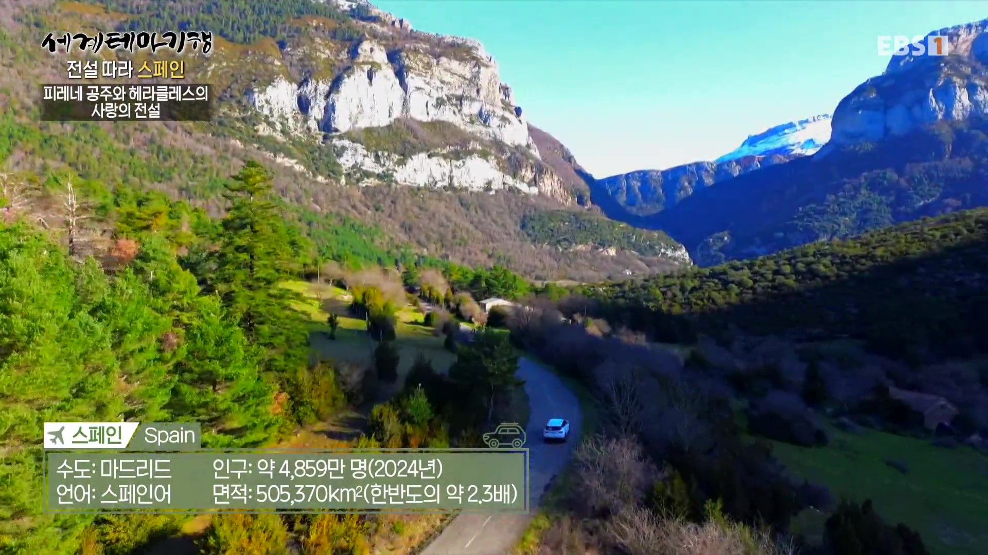 <EBS 세계테마기행>은 안방에 편안하게 앉아서 세계의 명소들을 체험할 수 있는 수준 높은 교양프로그램입니다. 각 방면에 걸쳐 다양한 지식을 가진 전문가가 출연해 실시하는 해설을 따라가노라면 실제로 해외여행을 하는 것 같은 착각에 빠지기도 합니다. 2024년 4월 초중순(2024. 4. 8∼4. 11)에는 “세계테마기행, 전설 따라 스페인”편이 방영되었습니다. 스페인의 국토면적은 한반도의 약 2.3배, 인구는 4,859만 명, 수도는 마드리드입니다.