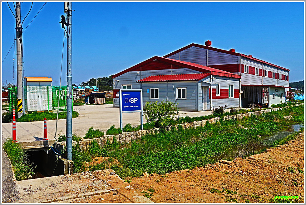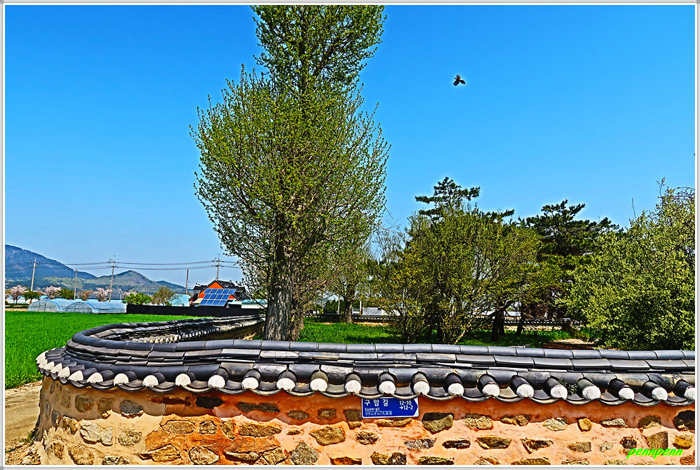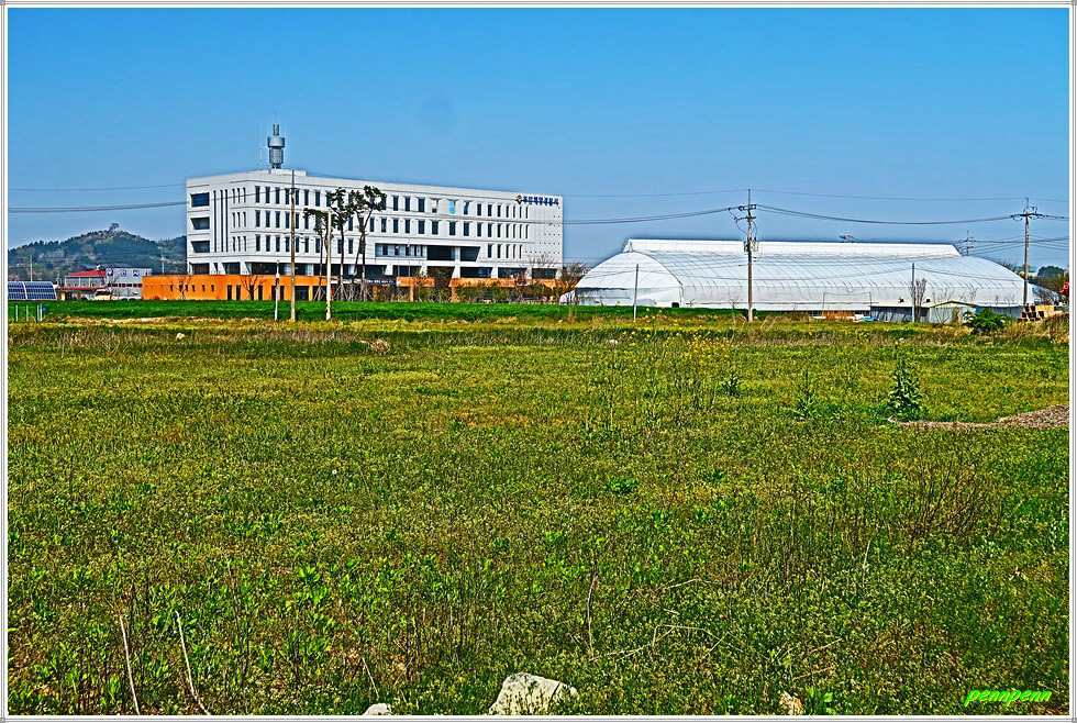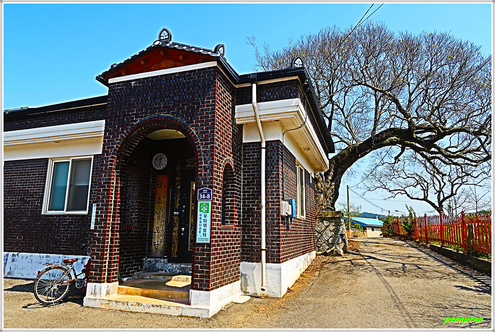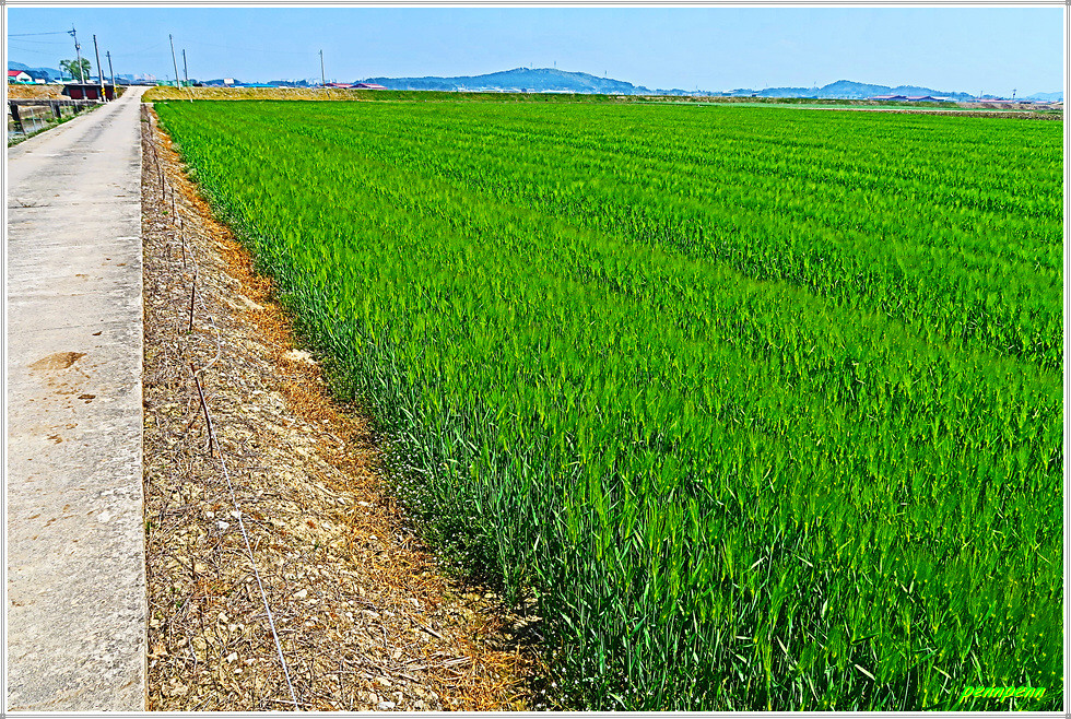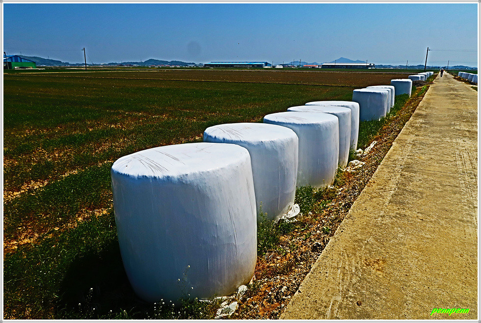 농로주변에는 곤포 사일리지(가축사료용 건초더미)가 놓여 있고 축사도 자주 보입니다. 아마도 부안지방은 소를 많이 기르는 모양이네요. 녹색으로 변한 밭의 보리는 벌써 이삭이 피었습니다. 주상천에 있는 대초양수장을 지나갑니다. 서해랑길은 농로를 따라 요리조리 이어지는군요. 대초경노당 인근에는 만첩홍매화가 눈이 부시도록 강렬한 붉은 빛을 발하고 있습니다.