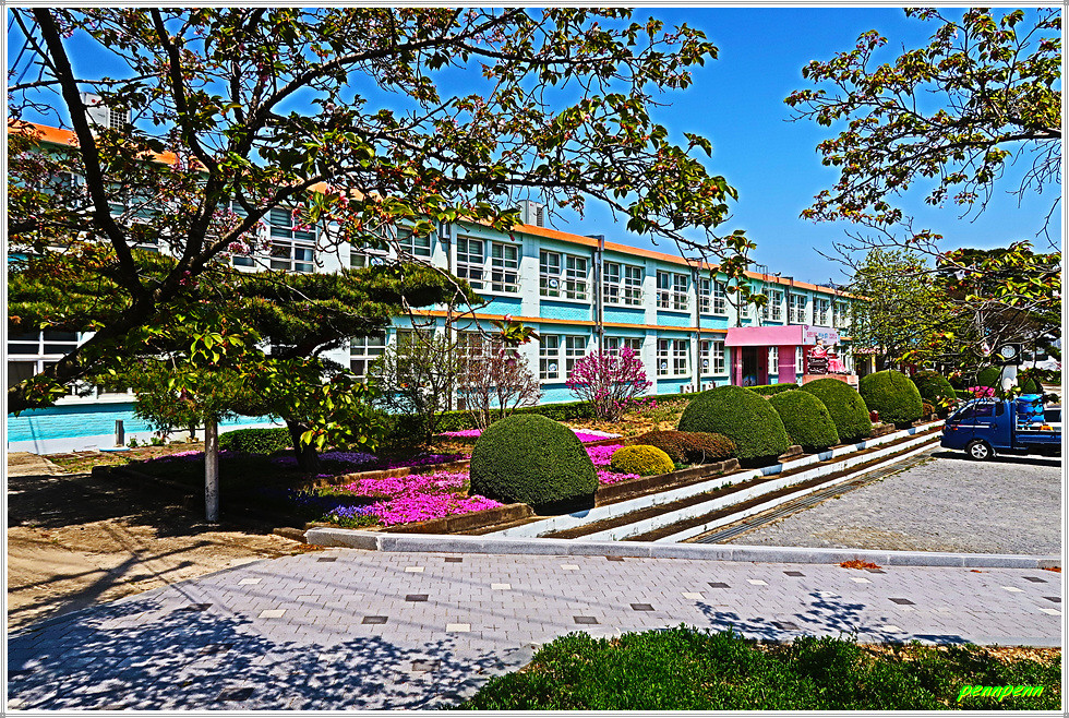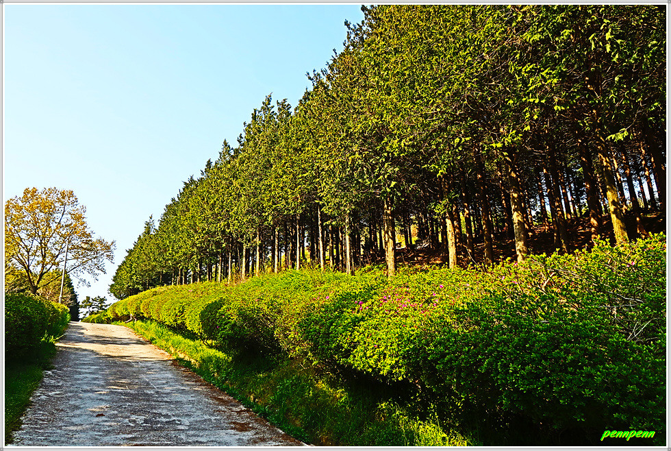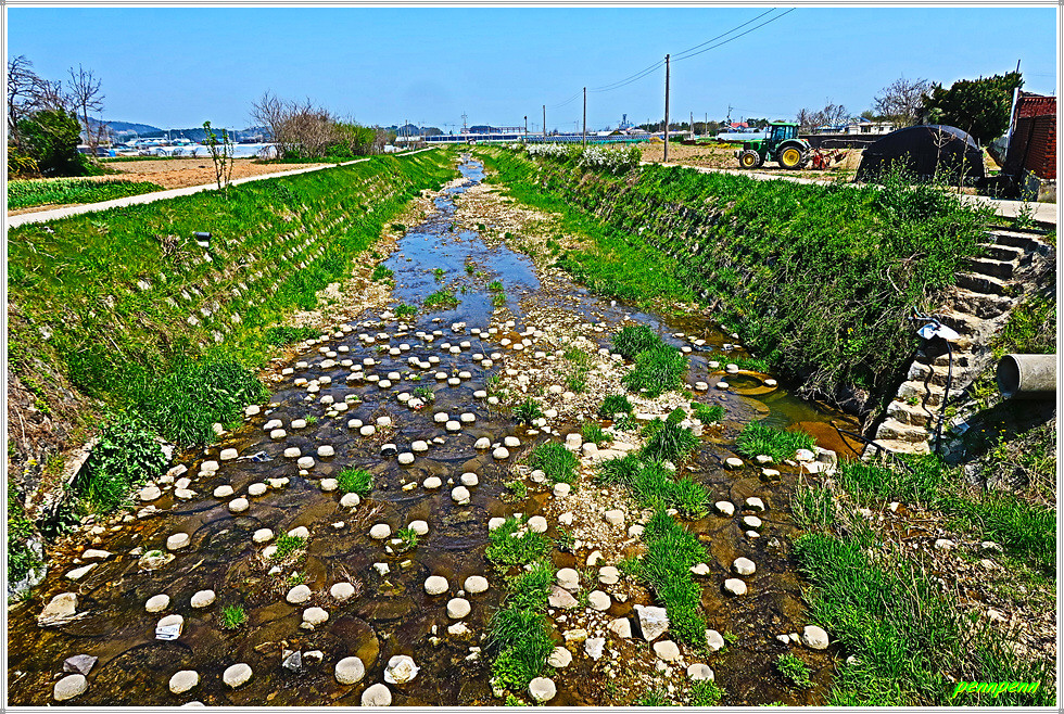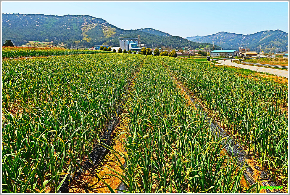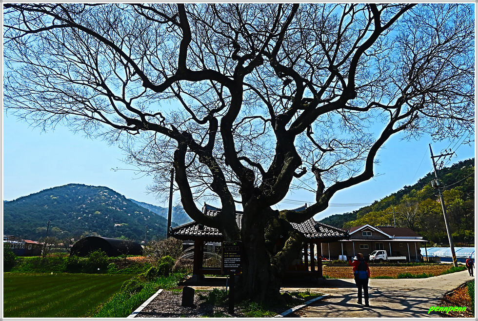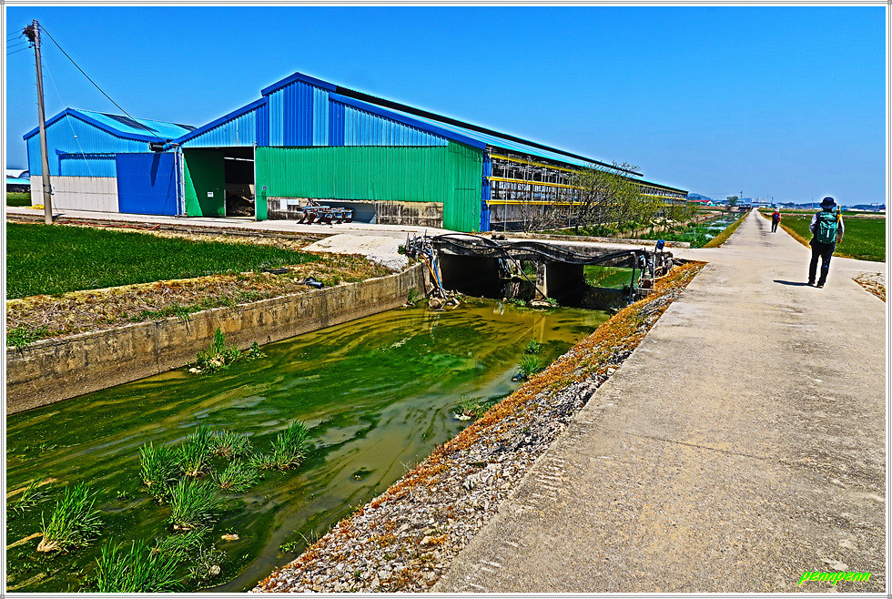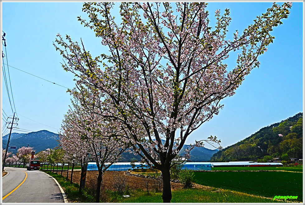 농로주변에는 곤포 사일리지(가축사료용 건초더미)가 놓여 있고 축사도 자주 보입니다. 아마도 부안지방은 소를 많이 기르는 모양이네요. 녹색으로 변한 밭의 보리는 벌써 이삭이 피었습니다. 주상천에 있는 대초양수장을 지나갑니다. 서해랑길은 농로를 따라 요리조리 이어지는군요. 대초경노당 인근에는 만첩홍매화가 눈이 부시도록 강렬한 붉은 빛을 발하고 있습니다.