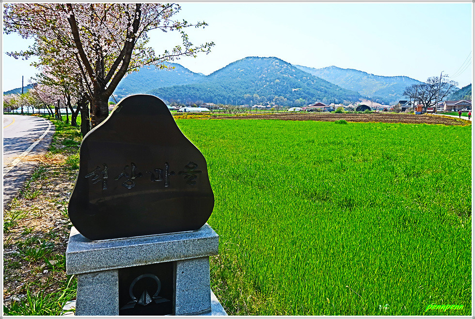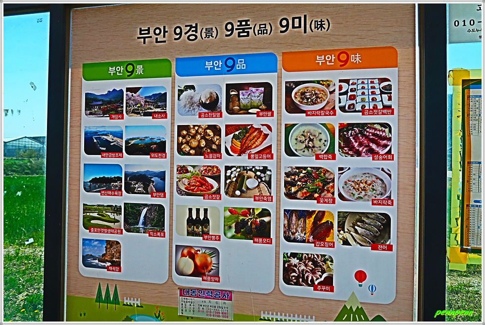 도로로 나와 구암교를 건너면 도화삼거리 옆에 고인돌휴게소가 있군요. 상서초등학교를 지나면 봉암마을버스정류소에 부안 9경9품9미 안내문이 붙어 있는데 이는 부안을 대표하는 경승지와 상품 그리고 맛있는 음식을 말합니다. 이곳 부안의 들녘도 참 넓은 것 같습니다. 분장버스정류장을 지나 농로쪽을 걸어가는데 길섶의 서양민들레와 민들레홀씨가 발길을 멈추게 합니다.