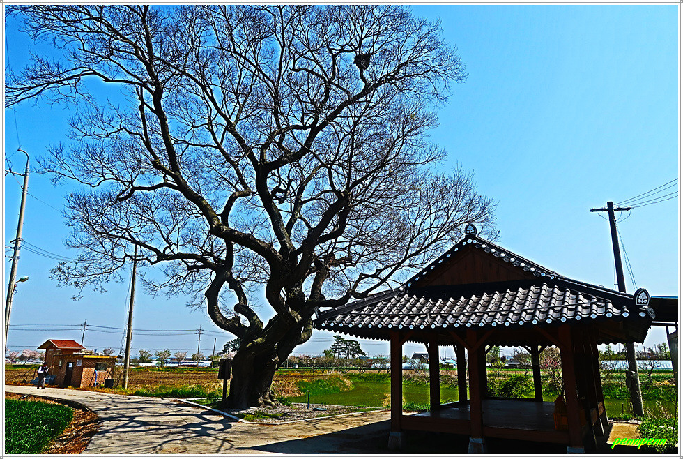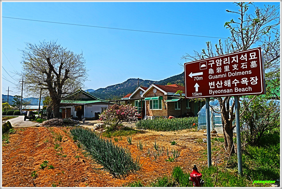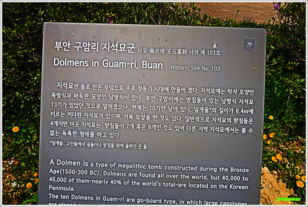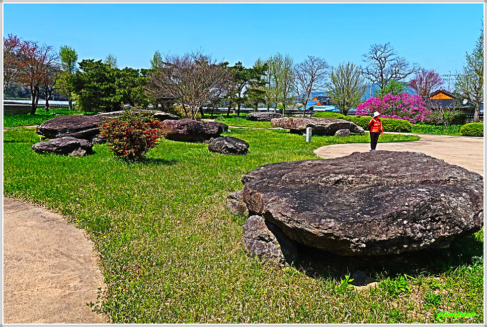 일반도로변에는 벚꽃이 화사하게 피어 있는 가운데 석상마을표석이 있는 곳에서 우측으로 진입합니다. 정자 옆에는 노거수인 팽나무 한 그루가 서 있는데 현지 안내문을 보니 보호수로는 지정이 되어 있지 않은 듯합니다. 이어지는 곳은 바로 부안군 하서면 석상리 소재 부안 구암리 지석묘군(사적 제103호)으로 청동기 시대의 고인돌 무덤(10기)입니다. 자연 암석을 떼어 내 덮개돌로 사용한 바둑판식 고인돌로 뚜껑돌이 큰 것은 8개의 받침돌을 돌려 받친 독특한 형태를 취합니다.