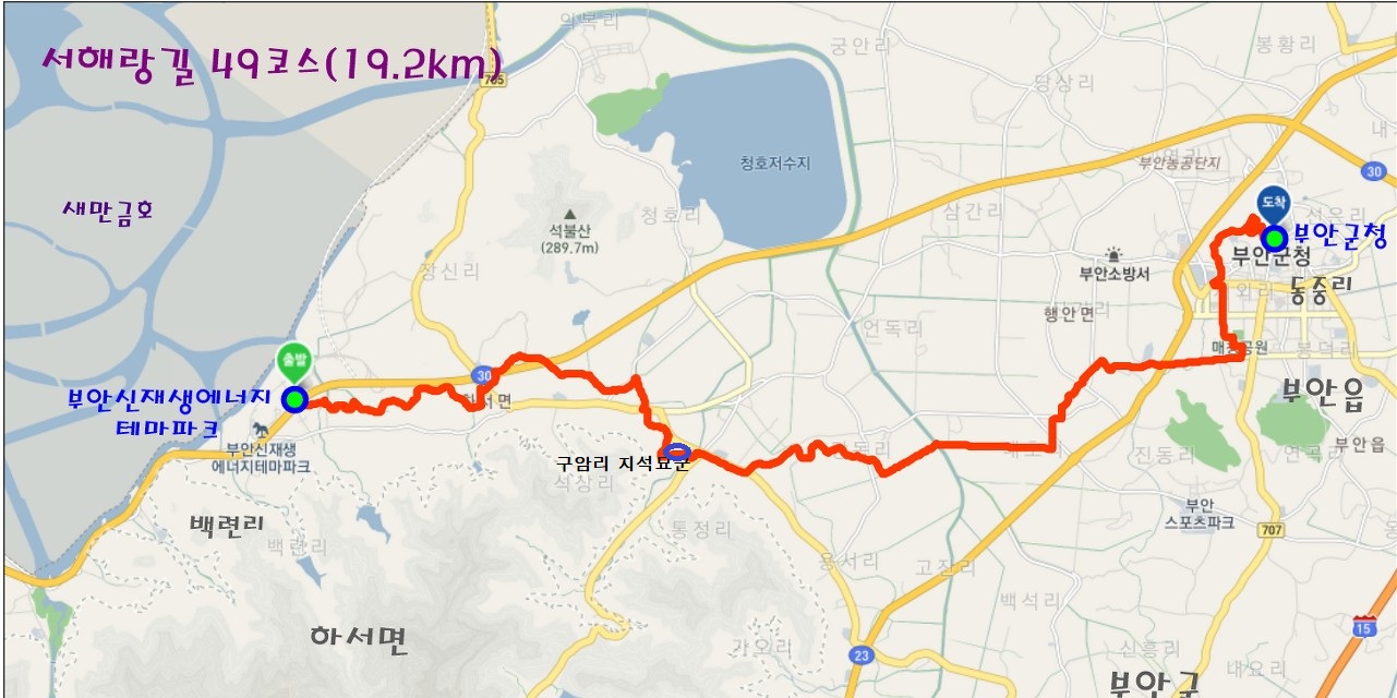 49코스의 출발지는 하서면 백련리 부안신재생에너지테마파크 내 월포마을경노당입니다. 부안군 하서면 백련리 소재 신재생에너지테마파크는 전국 최초로 조성되는 복합단지로 신재생에너지에 대한 연구와 실증 및 산업을 집적화해 동북아 메카로 발돋움하기 위해 조성한 테마파크입니다. 그런데 오늘 거리가 19km나 되어 월포마을경노당에서 약 6km 거리에 있는 구암리지석묘군 인근 705번 지방도로(고인돌로)의 석하마을버스정류장에서 출발합니다.