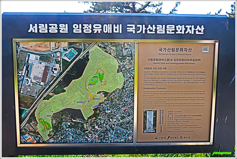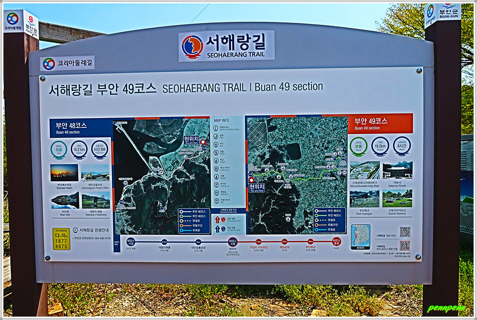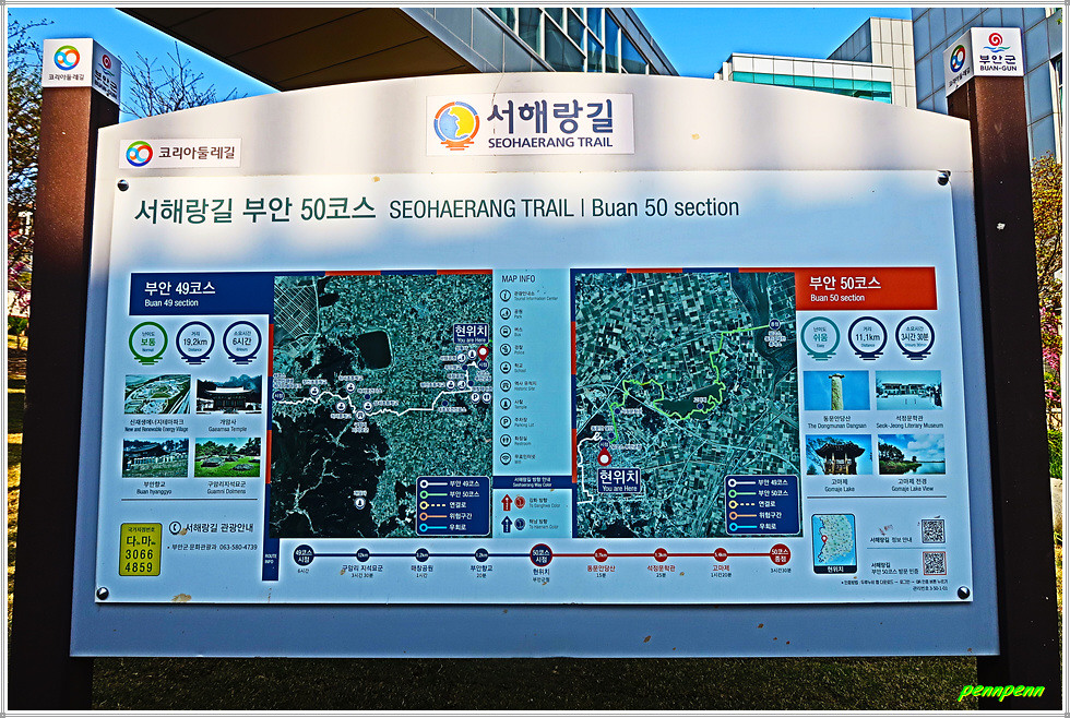 정자를 뒤로하고 좌측으로 조금 가면 부안군청 공영주차장 앞에 서해랑길 50코스 안내지도가 보입니다. 오늘 14km를 걷는데 약 4시간이 걸렸습니다. 농노길은 다소 지루했지만 구암리 지석묘군, 매창공원 및 테마관, 서림공원 등 볼거리가 많아 발걸음이 비교적 가벼운 나들이었습니다.