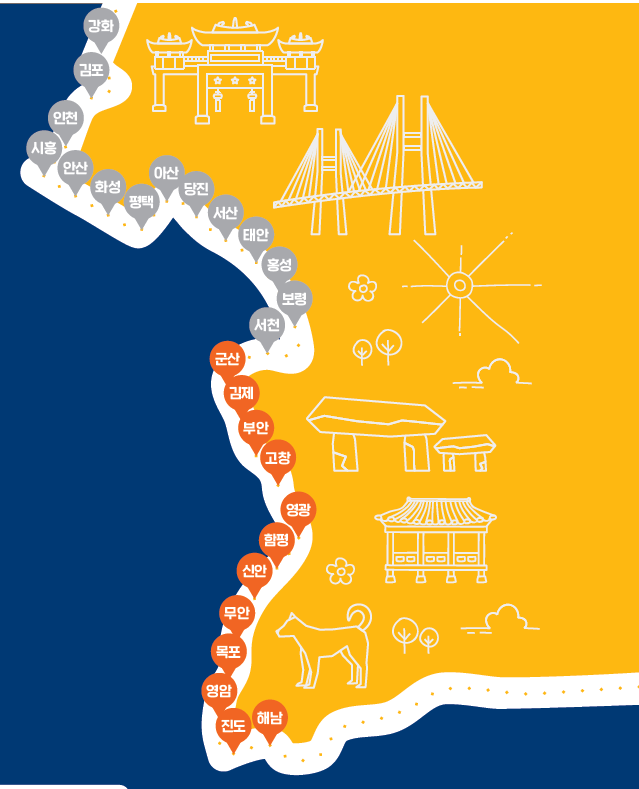 한반도의 남한지역을 일주하는 코리아 둘레길은 동해안의 해파랑길, 남해안의 남파랑길, 서해안의 서해랑길, 휴전선의 DMZ 평화누리길로 구성되어 있습니다. 이 중 서쪽바다와 함께 걷는 서해랑길은 전남 해남의 송호리 땅끝탑에서 출발해 서해안을 따라 북쪽 인천 강화도 평화전망대에 이르는 103개 코스 1,804km에 달하는 장대한 트레일 코스입니다. 이 길을 걸으며 유네스코 세계유산으로 지정된 드넓은 갯벌과 황홀한 일몰, 그리고 종교와 문물교류의 역사를 만나게 됩니다.
