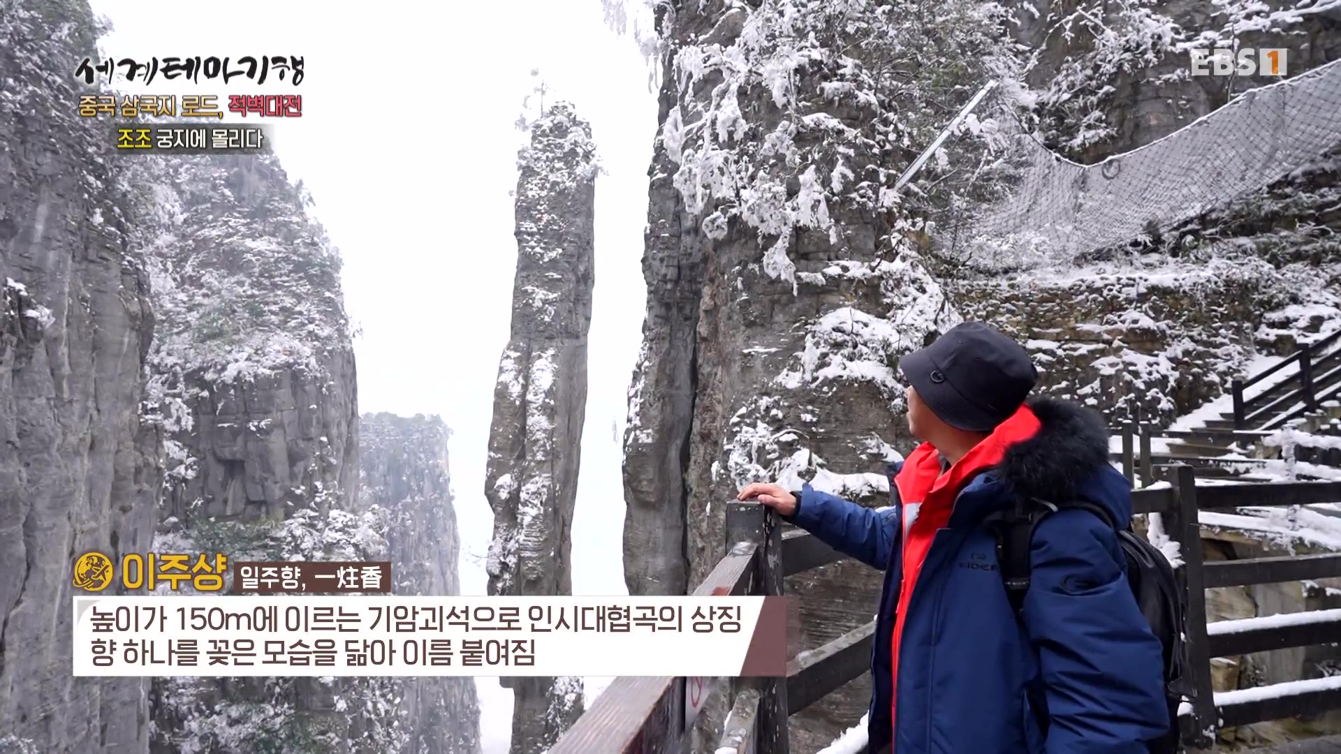 언스대협곡은 동양의 그랜드캐니언으로 불리는 총 길이 108km에 달하는 싱크홀과 암석기둥 등이 있는 복합카르스크지형을 말합니다. 케이블카를 타고 올라가 트레킹을 시작하는데 보이는 풍경은 한마디로 절경입니다. 잔도(바위벼랑길)를 걸을 때는 정말 아찔하지요. 일주향은 높이 150m의 바위기둥이 향 하나를 꽂은 모습으로 직립한 이곳의 명품 기암괴석입니다.