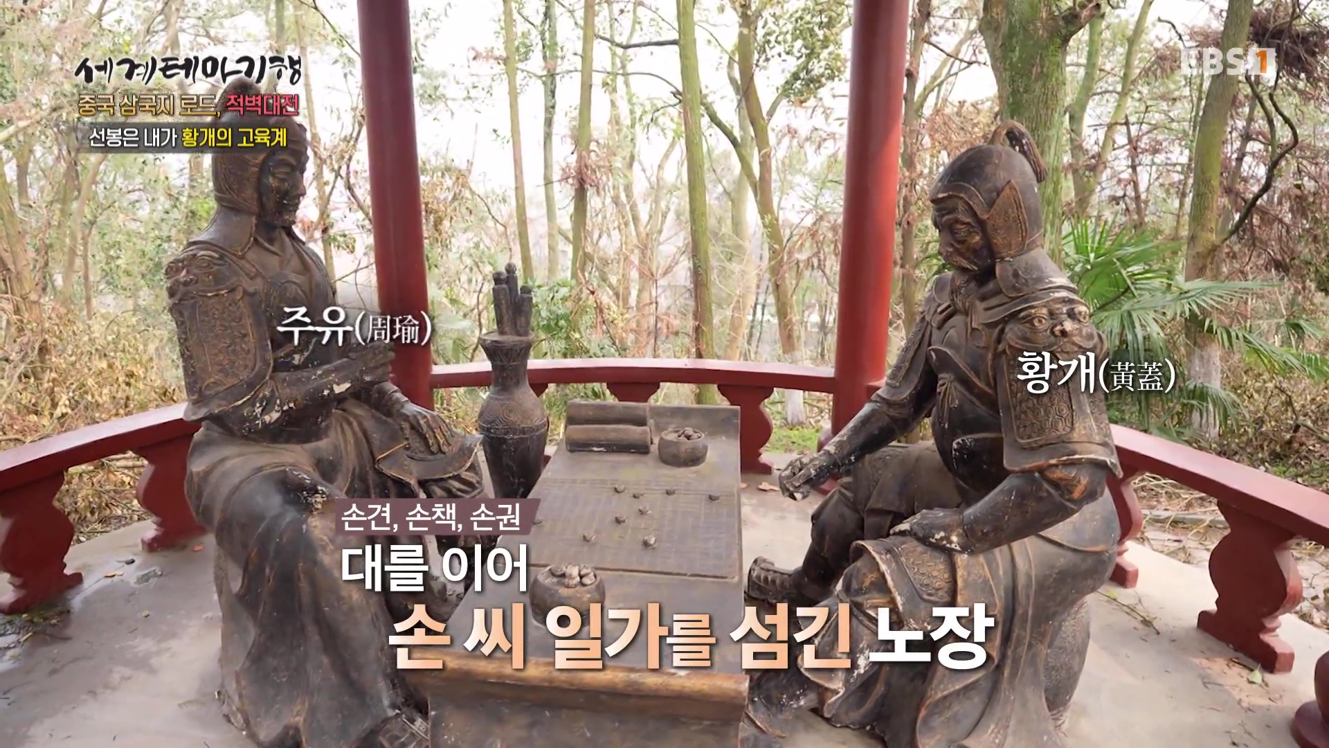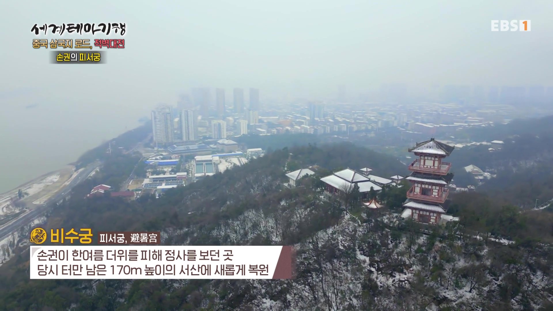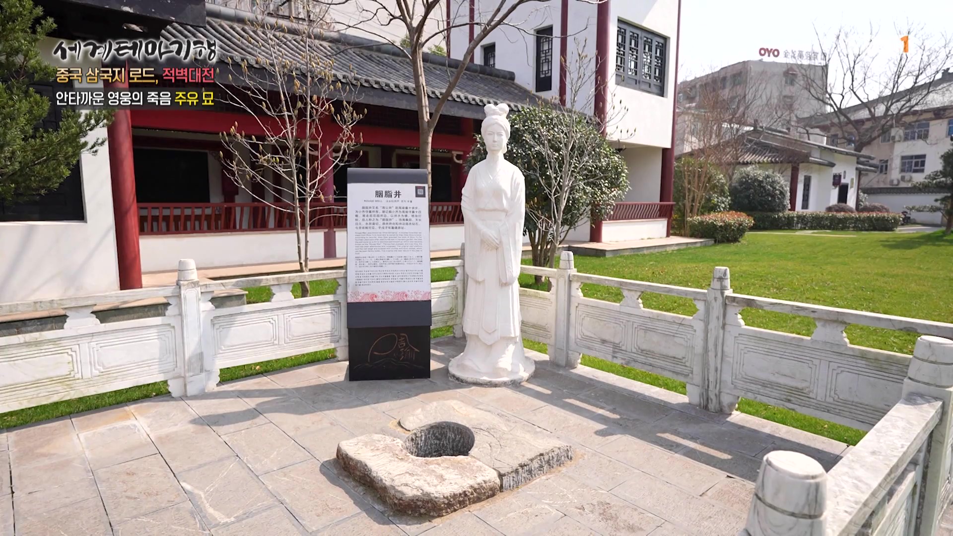 어저우(악주)는 손권이 적벽대전에서 승리한 후 자신을 오나라 황제로 선포한 곳입니다. 피서궁은 손권이 더위를 피해 서산에 세운 궁전(집무실 겸 휴양지)입니다. 손권시금석은 손권이 장검으로 바위를 내리쳐 자른 바위를 말합니다. 적벽대전을 승리로 이끈 주유는 위험인물인 유비를 제거하려 했으나 뜻을 이루지 못하고 병사했는데 그의 무덤은 부인인 소교가 지키고 있습니다.
