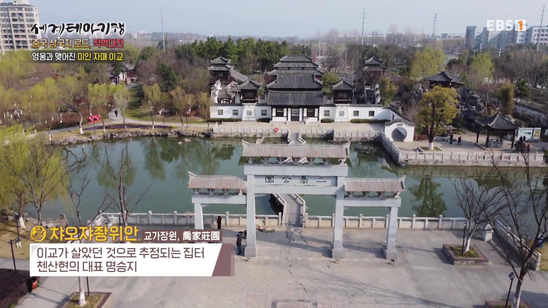 주유(175-210)의 고향인 위성촌 주유성으로 가서 그의 동상을 만났는데 명성에 비해서는 매우 초라합니다. 주유문화공원에는 주유의 사당이 있지요. 교가정원은 당시 최고의 미녀였던 소교-대교 자매가 살았던 것으로 추정되는 집터로서 복원한 것입니다. 주유는 절세미인 소교와, 손책은 대교와 결혼해 주유와 손책은 친구에서 동서로 가족이 되었습니다.