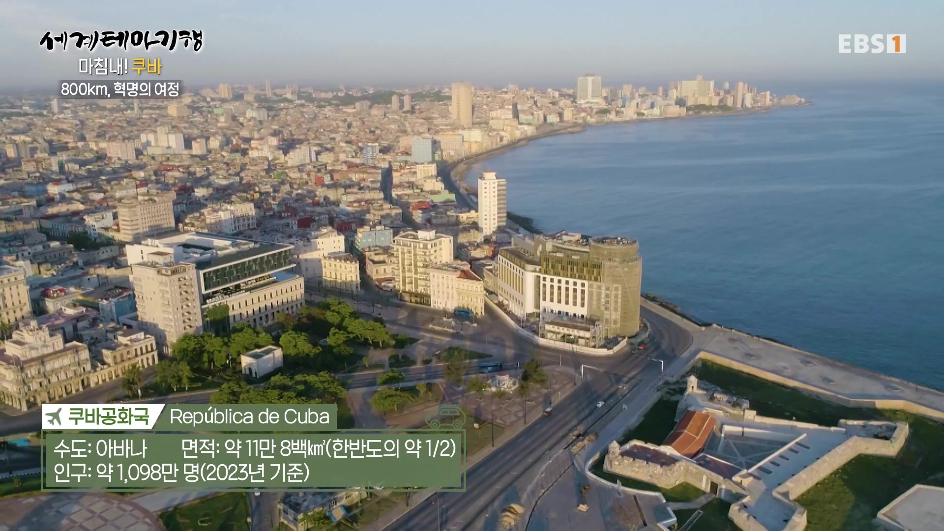 <EBS 세계테마기행>은 안방에 편안하게 앉아서 세계의 명소들을 체험할 수 있는 수준 높은 교양프로그램입니다. 각 방면에 걸쳐 다양한 지식을 가진 전문가가 출연해 실시하는 해설을 따라가노라면 실제로 해외여행을 하는 것 같은 착각에 빠지기도 합니다. 2024년 4월 하순(2024. 4. 22∼4. 25)에는 “세계테마기행, 마침내 쿠바”편이 방영되었습니다. 쿠바의 국토면적은 한반도의 약 0.5배, 인구는 1,119만 명, 수도는 아바나입니다.