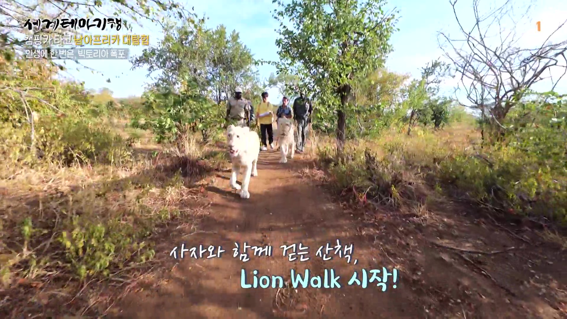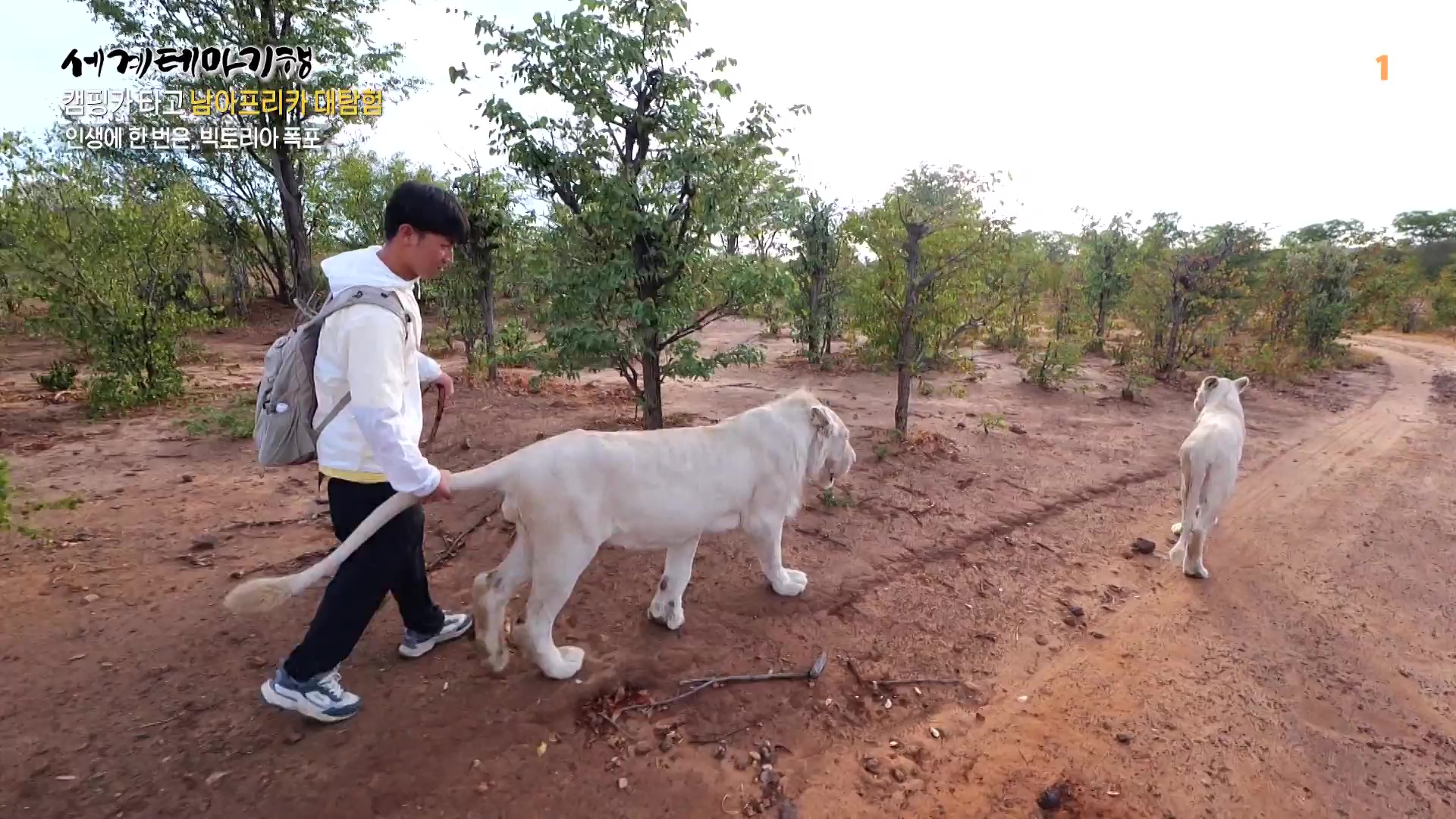 황게국립공원은 야생동물들과 체험을 할 수 있는 곳입니다. 사자를 보호하는 고아원에서 흰 사자와 함께 걷습니다. 이곳 사자도 걷기를 좋아한다는군요. 야생성이 생기기 전인 2살 이하의 사자만 가능합니다. 사자와 걸으며 손으로 엉덩이 부문을 쓰다듬으며 꼬리도 만져보지만 사자가 가만히 있는 게 참으로 신기한 체험입니다. 돌연변이로 태어난 흰 색 사자는 야생에서 다른 동물들의 눈에 잘 띄어 위장하기 어려워 공격을 많이 받아 개체수가 감소한답니다. 이곳의 목표는 이들 사자들을 야생의 세계로 돌려보내는 것이랍니다.