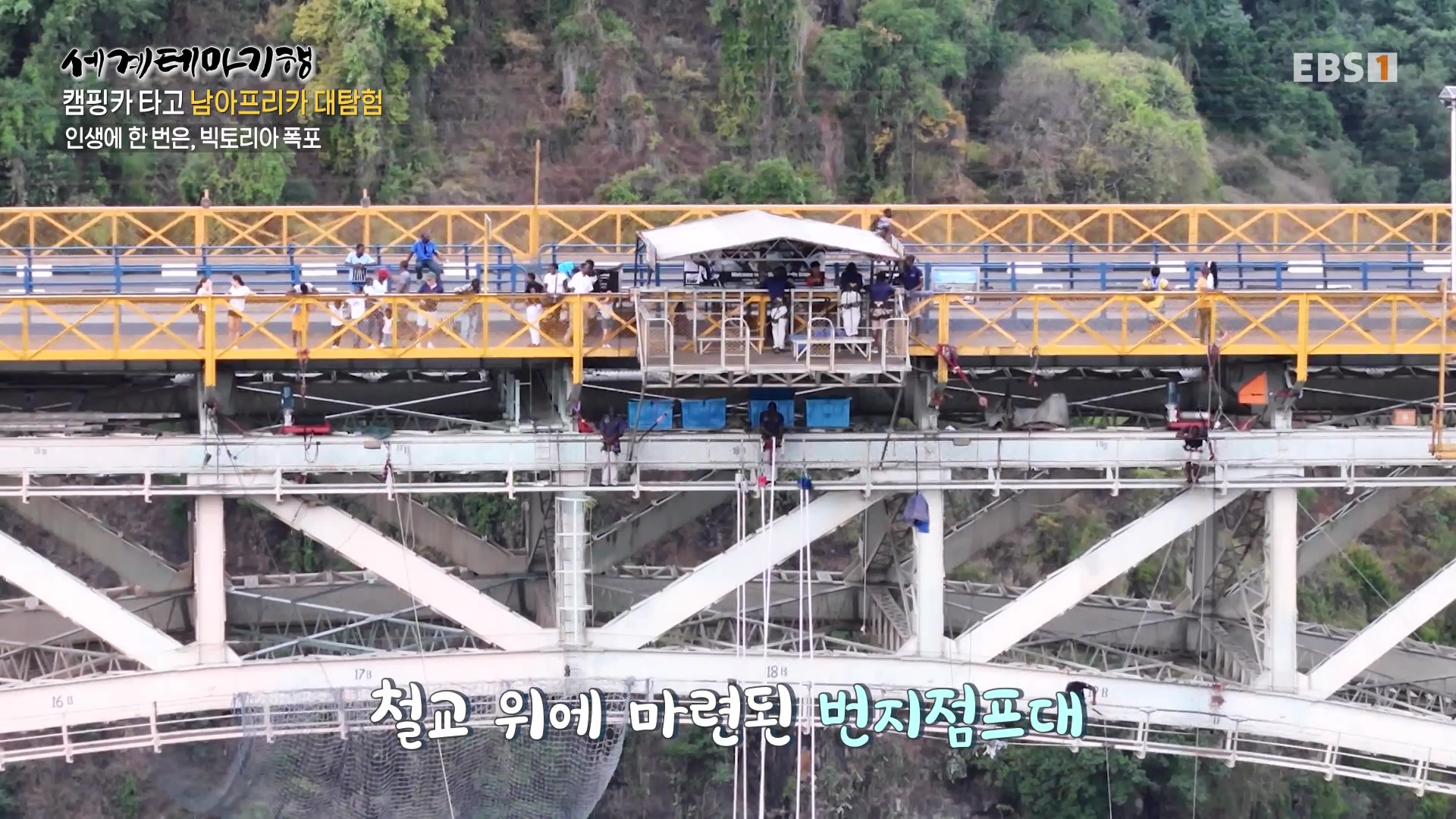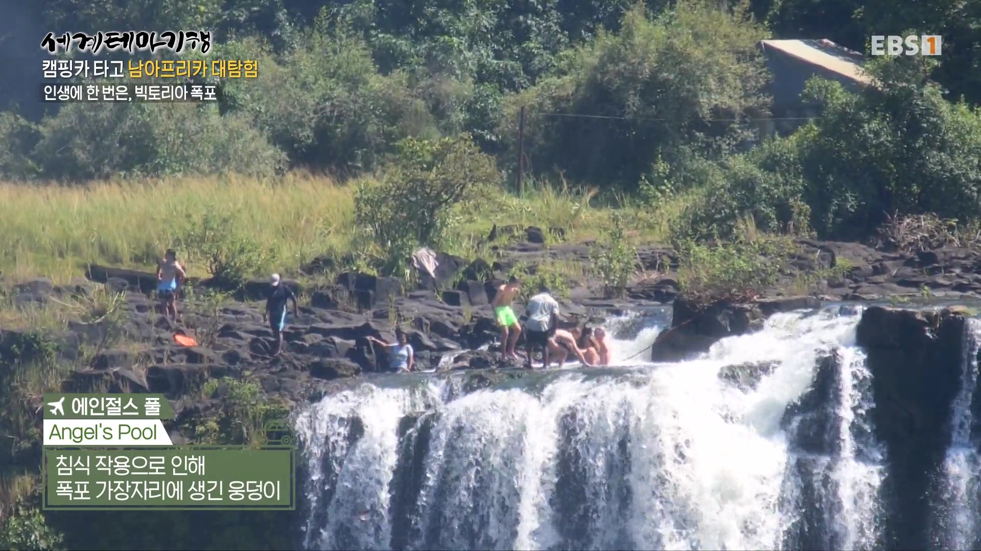 빅토리아 폭포 철교 위에 마련된 번지점프대에서 뛰어 내리는 것은 모험을 즐기는 분들이라면 꼭 도전해보고 싶은 이벤트입니다. 높이가 111m에 달하는 이곳은 세계 3대 번지점프성지라고 합니다. 안전요원의 한국어가 유창하네요. 다른 하나의 모험은 폭포가장자리의 풀(pool)에서 수영을 하는 것인데, 하늘에는 반달 같은 무지개가 떠 있군요. 가이드가 손으로 잡은 다리를 놓아버리면 체험자는 그냥 물귀신이 되고 말 것입니다.