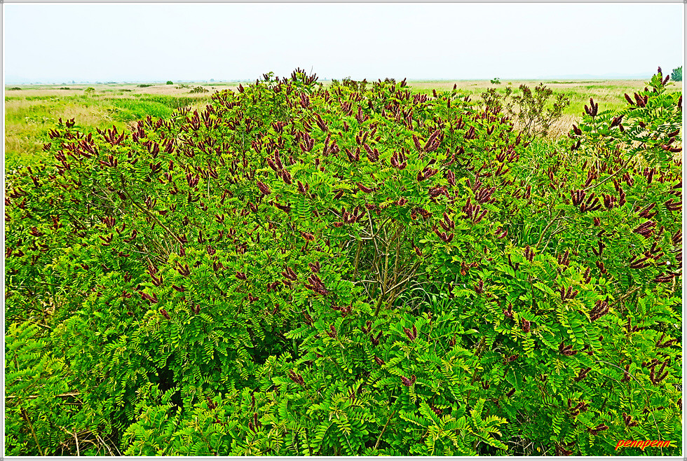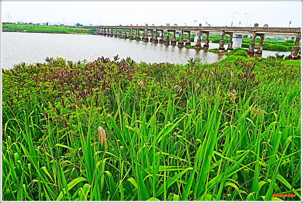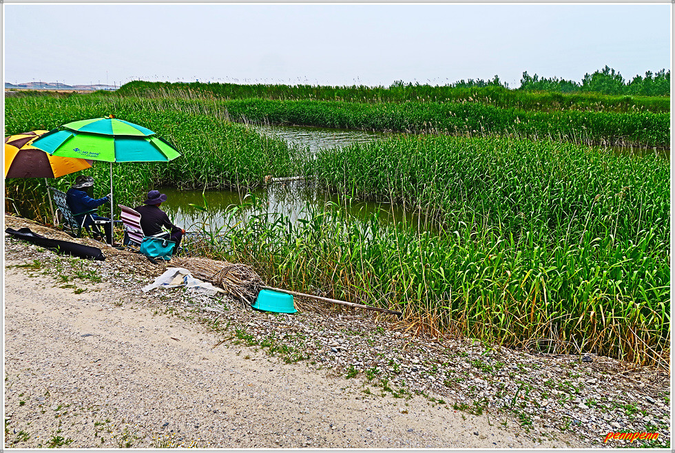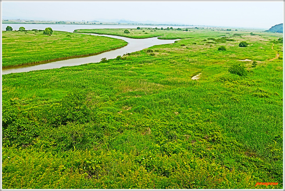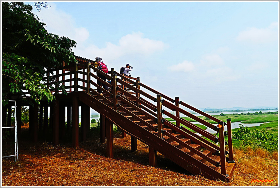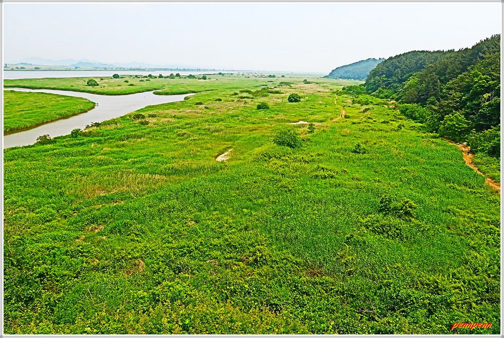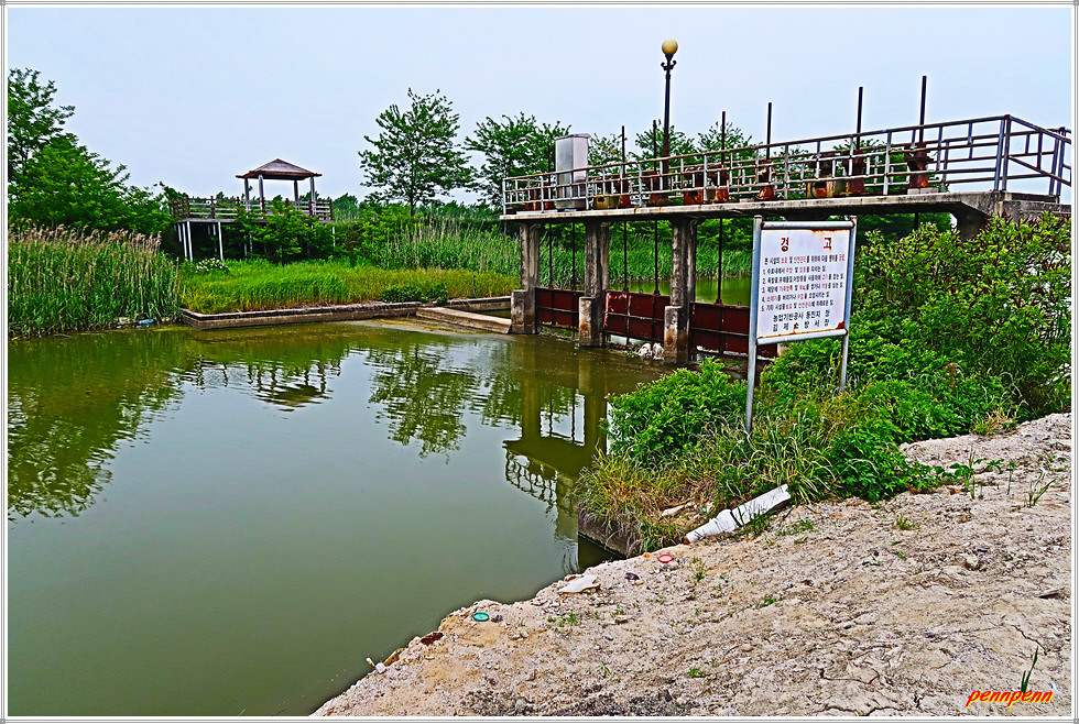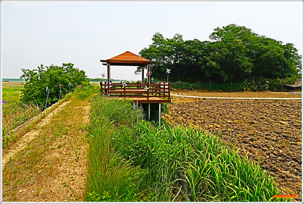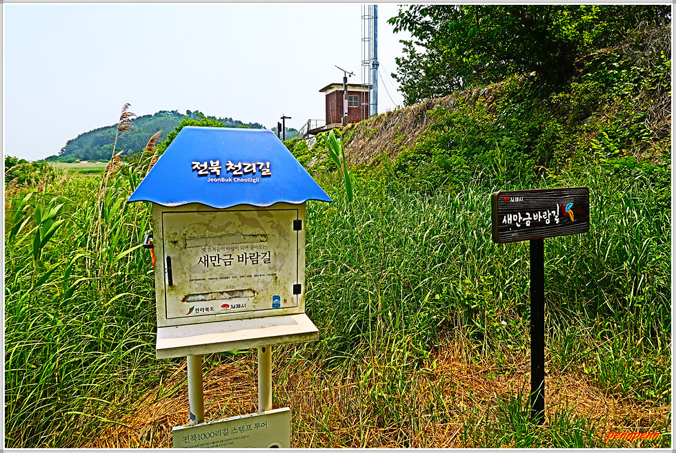 망해사를 뒤로하고 계속하여 북동쪽으로 갑니다. 숲을 빠져 나가니 사진찍기 좋은 녹색명소 전망대인데 이곳에 올라 바라보는 만경강병의 습지는 온통 녹색의 세상이 펼쳐진 모습입니다. 서해랑길은 강변의 하상으로 이어지는 데 지도상으로는 마치 수상데크길로 보이지만 실제로는 강변에 조성된 녹색길입니다. 길목에 설치해둔 바람개비 조형물은 사진촬영포인트로 손색이 없습니다.