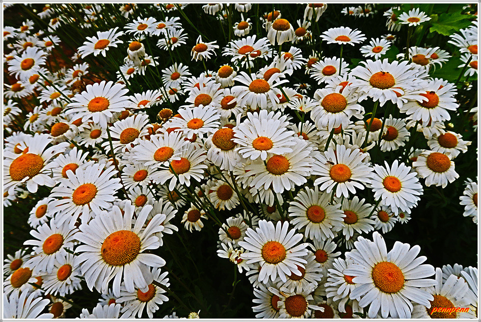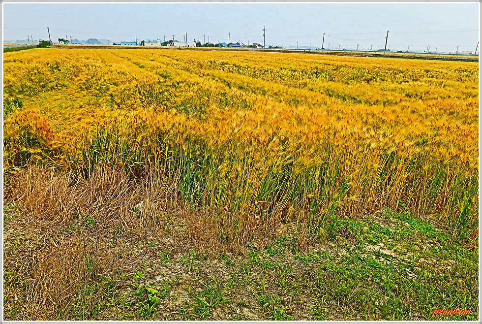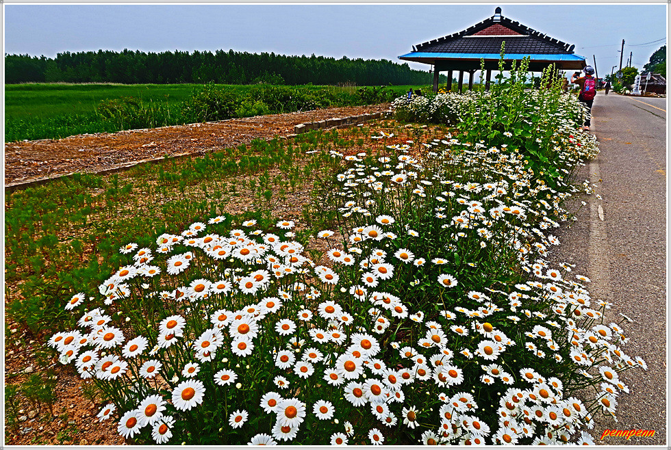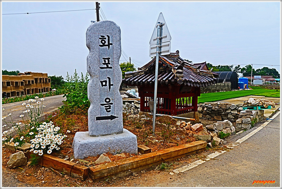 지금 걷는 이 길은 새만금 광역탐방로인데, 만경읍 토정마을에서 진봉면 심포마을에 이르는 12.5km의 도보길입니다. 그러고 보면 오늘 우리는 새만금 관역탐방로를 걸어왔군요. 화포마을에는 샤스타데이지가 군락을 이뤄 길손을 반겨줍니다. 마을 입구에는 충효충렬비가 서 있군요. 초지가 많은 곳에는 곤포 사일리지(가축 사료용 건초더미)가 무더기로 쌓여 있습니다.