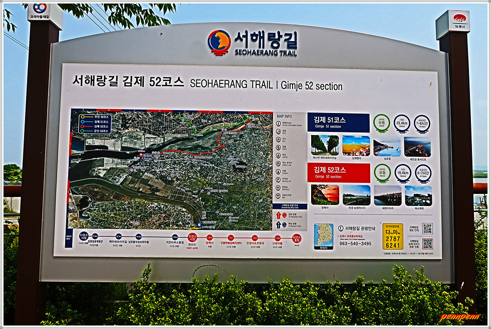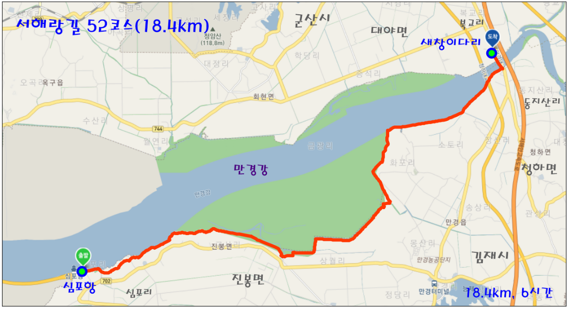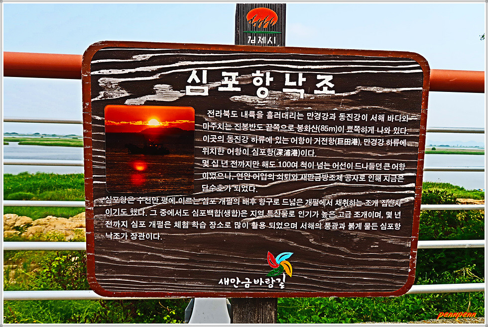 51코스의 출발지는 진봉면 심포리 심포항입니다. 김제시 진봉면 심포리 소재 심포항은 만경강이 서해와 만나는 지점에 조성된 포구입니다. 예전에는 그 규모가 꽤 컸었으나 현재는 새만금간척지조성사업으로 겨우 명맥을 유지해오고 있습니다. 만경강은 전라북도 완주군 동상면과 소양면의 경계인 원등산(遠登山, 713m)에서 발원하여 호남평야의 중심부를 지나 황해로 흘러드는 길이 74km의 강으로 군산시 옥서면과 김제시 진봉면의 사이를 흘러 새만금간척지로 흘러듭니다.