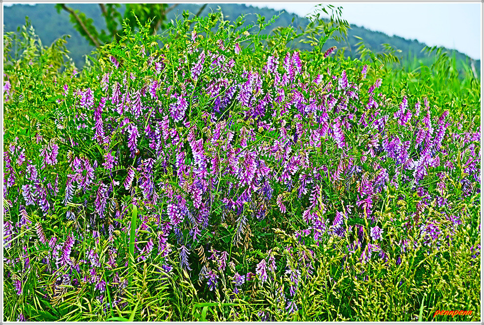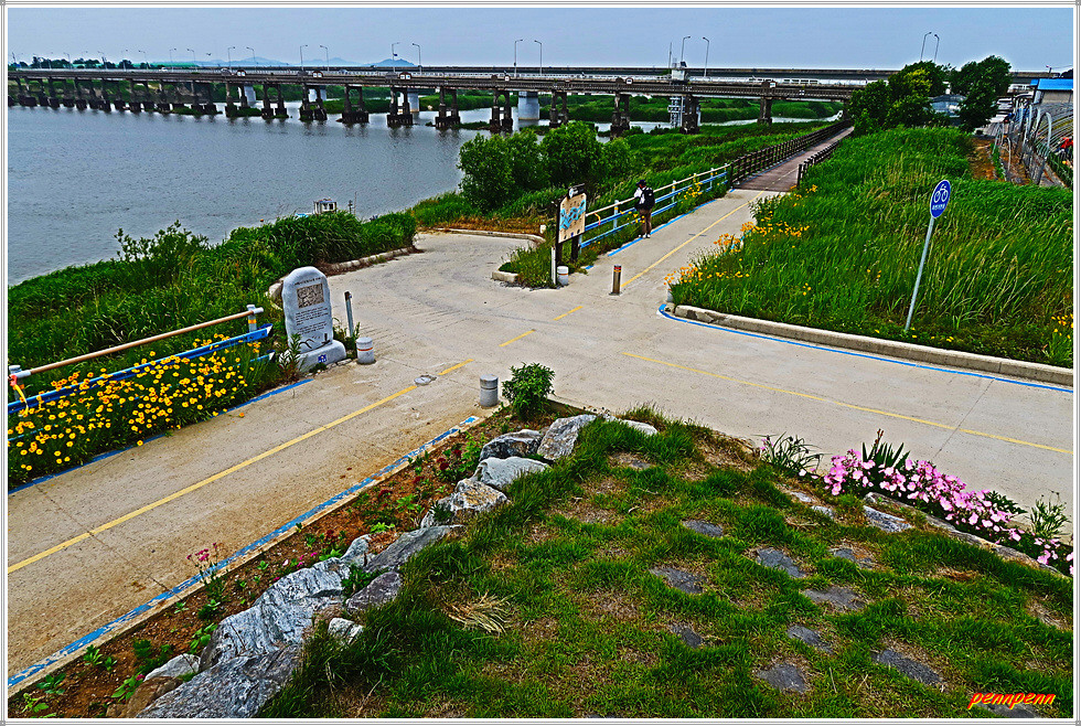 이제부터는 만경강변에 조성된 자전거길을 따라 걷습니다. 금계국이 군락을 지어 피어 있는 정자에 오르면 초지에 조성된 데크길을 내려다 볼 수 있습니다. 길섶에는 갈퀴나물이 무리를 지어 피어 있네요. 만경강을 가로지르는 청하대교 굴다리를 통과하면 우측에 정자가 있는데 이곳은 만경8경 중 제2경인 신창지정(新倉之情)을 볼 수 있는 명소입니다.