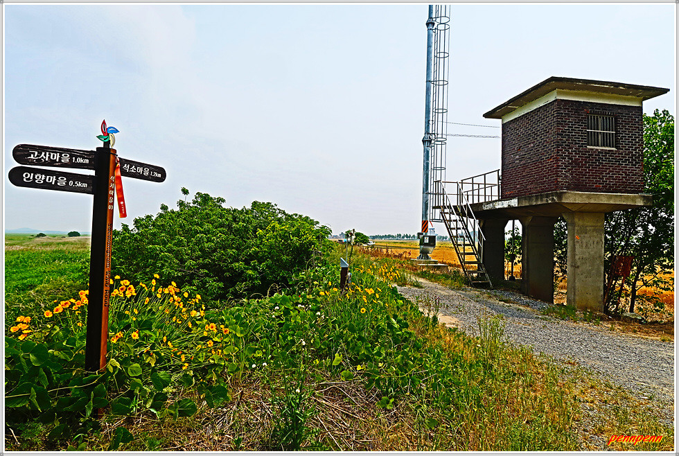 전선포 제방을 걷는데 이젠 보리와 밀을 수확한 후 모내기를 하는 논이 전점 늘어나고 있는 모습입니다. 다시 숲길로 들어서서 나성산 정상 대신 좌측으로 갑니다. 길섶의 군부대 근무초소가 과거 동해안에서 해안근무를 했던 필자의 사병복무시절을 떠올리게 하는군요. 그래도 여기는 비를 피할 수 있는 초소라도 있지만 울진지역에서 복무할 당시에는 초소가 없어 그냥 해안에서 눈과 비를 맞으며 나라를 지켰습니다.