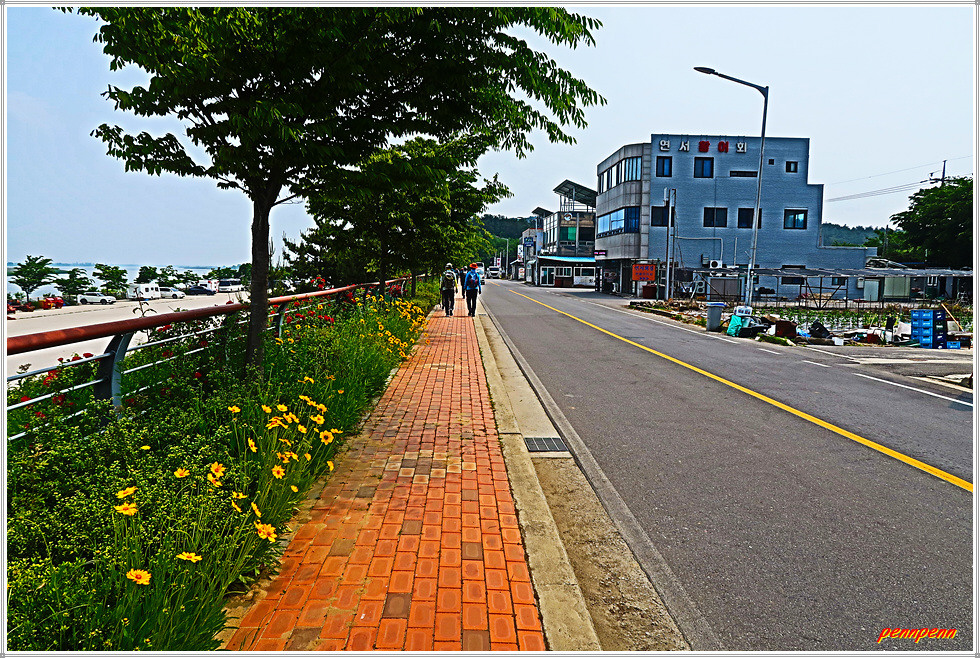 심포항 입구 로터리에서 동쪽으로 갑니다. 포구의 선착장 옆 강변은 자동차 캠퍼들의 차지가 되었고 한 때 번성했던 횟집을 비롯한 상가거리도 활력을 잃은 모습입니다. 길섶에는 송엽국과 찔레꽃이 화사하게 피어 있군요. 상가가 끝나는 지점에 김제를 알리는 입체글씨, 아름다운 심포항 낙조, 새만금 바람길 안내도가 세워져 있습니다.
