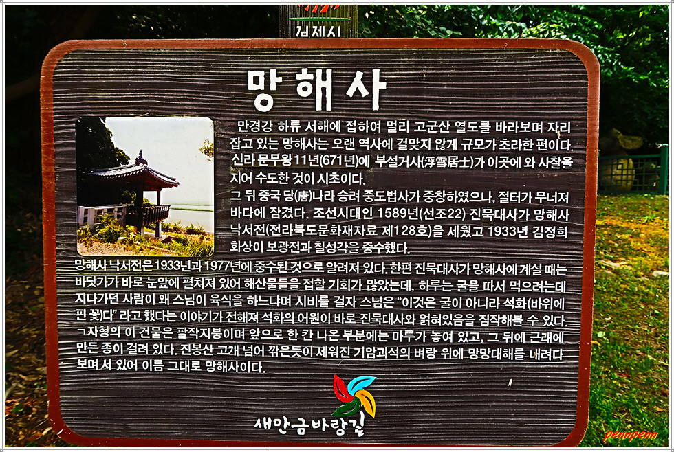 여기서 좌측으로 약 100여 미터 내려가면 만경강변에 자리 잡은 망해사입니다. 만경강 하구 진봉산 자락의 망해사는 백제 의자왕 2년(642) 부설거사가 창건하였다고 전해지는 천년고찰로 조선 인조대왕 때 진묵대사가 재건해 크게 번창시킨 절입니다. 사찰이 서해의 섬들을 바라볼 수 있는 곳에 자리 잡고 있으며 서해의 일몰을 한눈에 볼 수 있는 경승지여서 망해사(望海寺)라고 부르게 되었습니다.