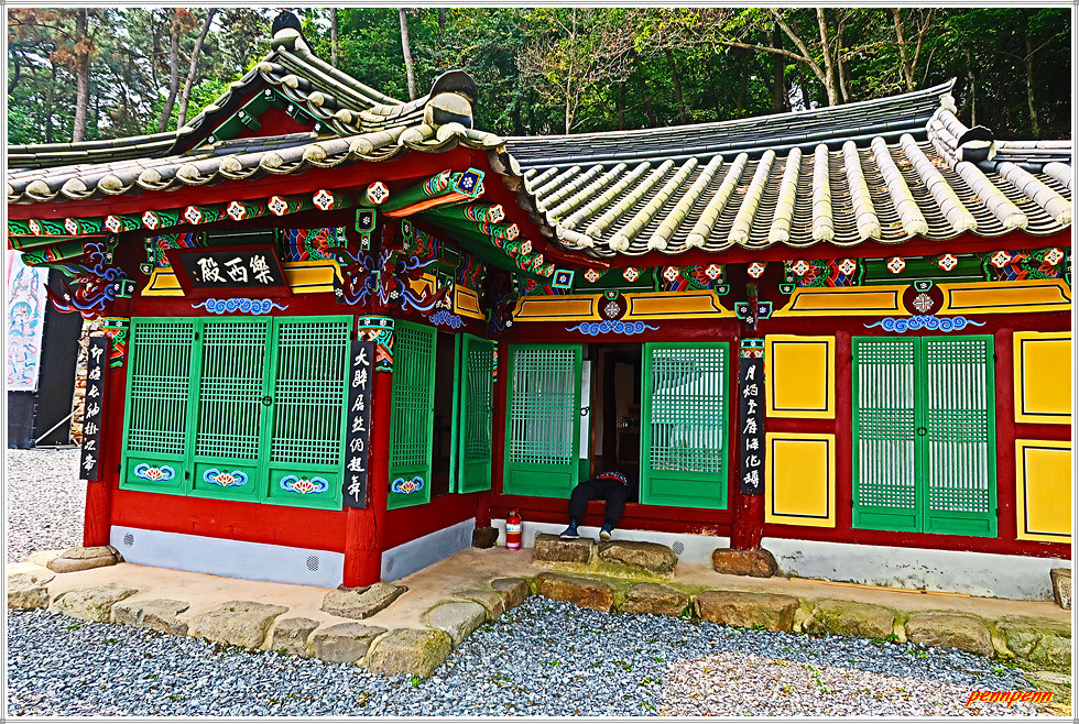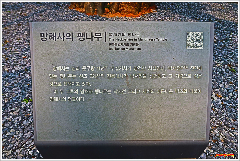 범종각 옆에는 낙서전이 있는데 이는 16세기 진묵스님이 처음 짓고 20세기 2차례에 걸쳐 고쳐지은 것입니다. 낙서전 앞에는 두 그루의 팽나무가 있는데 진묵대사가 낙서전을 짓고 그 기념으로 식수한 것으로 전해지는 나무입니다. 이 팽나무는 망해사의 명물이라고 합니다.