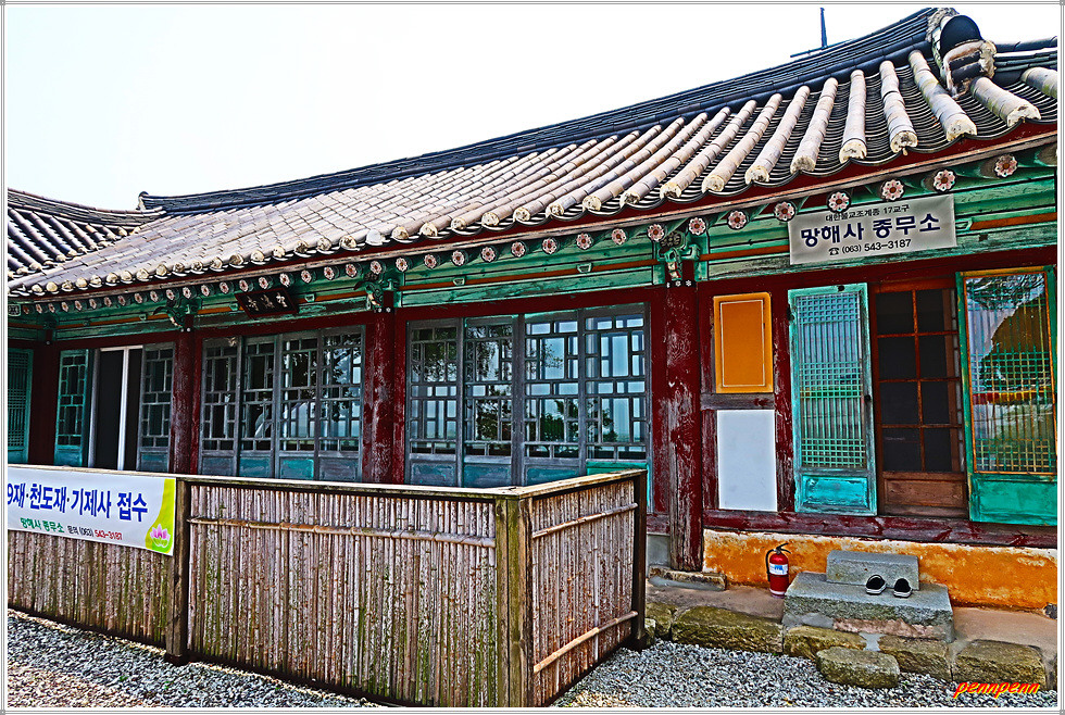 경내로 들어서면 좌측에 청조헌, 망해사, 망해사 종무소 현판이 붙은 하나의 건축물이 있습니다. 바닷가에는 5층석탑과 범종각이 있는데, 종루에 서면 만경강하류(서해의 새만금 앞바다)가 잘 조망됩니다. 이곳에서 바라보는 낙조를 최고의 경관으로 자리매김하더군요.